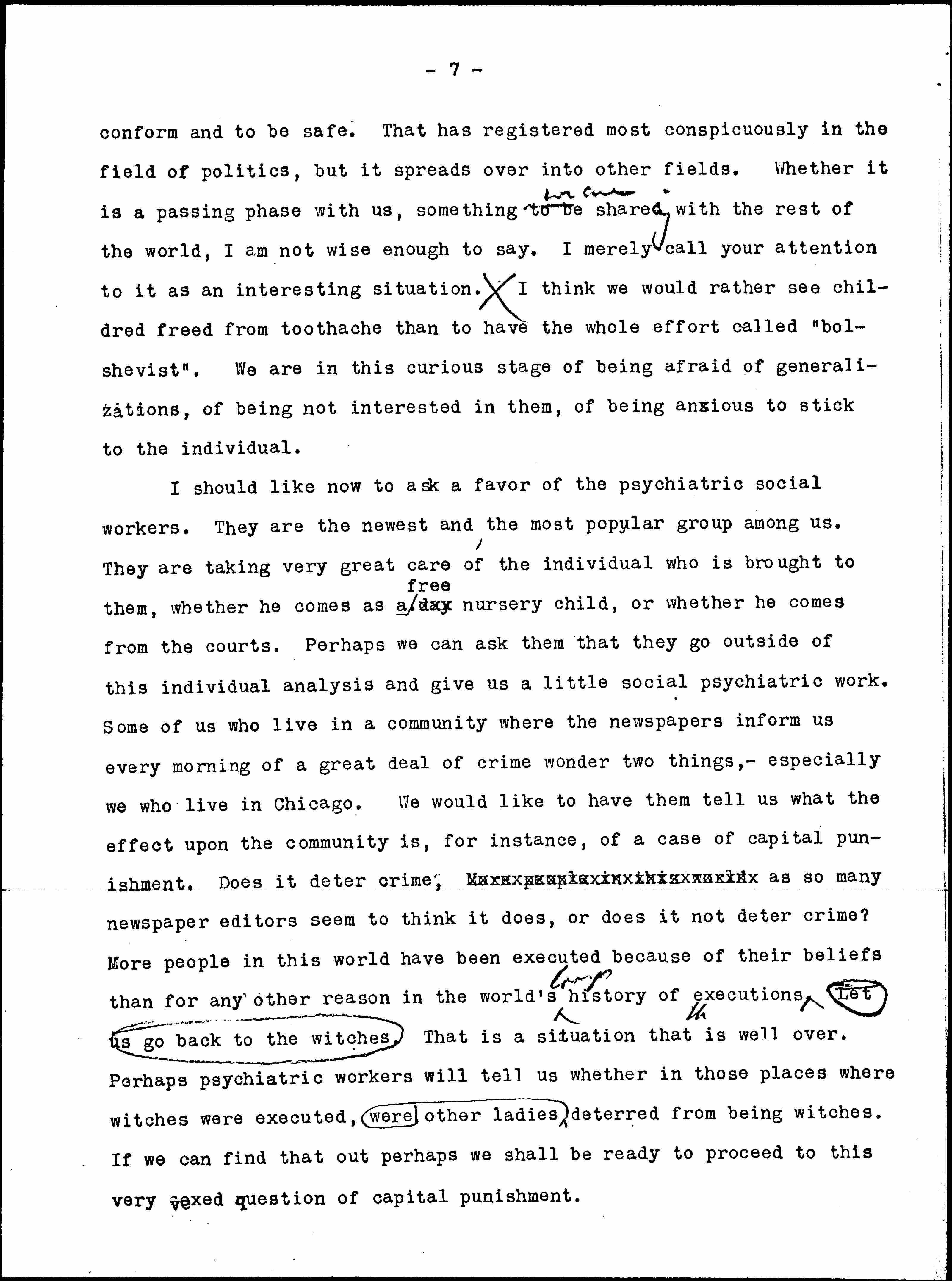 Some years ago, in the nineties (by that I mean the last decade of the last century) we used to have at these meetings almost always a sharp challenge upon the construction of society itself. It was said that certain social mechanisms and arrangements were so awkward and so unfair that they produced almost automatically crime ↑produce [?]↓ because they destroyed [individual] ↑effort & cramped energy↓, -- that if we changed social conditions so as to foster [personality] then they ↑such individuals↓ would thrive and in the end would produce for themselves a better social order. We do not talk about that any more. I remember at one of our meeting a socialist made a long and rather tiresome address. When he sat down one of the men in the audience arose and said "Well, that was a pretty sweeping speech you made. You act as if you thought socialism would cure the toothache." The socialist replied, "Of course it would cure the toothache. If every child were looked after by the state and his teeth attended to all the way along from infancy of course toothache would disappear from the world." Now, I claim ↑It is not true↓ that in the years since that happened we have dropped more or less the discussion of social theories and paid a good deal of attention to the toothache. I am sure that in most cities, with their nursery schools, and their nutrition classes, and their school nurses, and their dental services ↑sustained↓ applied by the city health departments, toothache is being abolished. But ↑this effort is [the]↓ quite divorced from any social theory. Indeed if any ↑a↓ social theory were to be attached to this occupation ↑[it]↓ social workers would ↑probably↓ be frightened away and feel they must drop it. It is curious how We are willing to work hard at definite social tasks when ↑but↓ we are not quite willing to have discuss social theories. We share a certain desire to [page 7] conform and to be safe. That has registered most conspicuously in the field of politics, but it spreads over into other fields. Whether it is a passing phase with us, something to be ↑we can↓ share with the rest of the world, I am not wise enough to say. I merely call your attention to it as an interesting situation. I think we would rather see children freed from toothache than to have the whole effort called "bolshevist." We are in this curious stage of being afraid of generalizations, of being not interested in them, of being anxious to stick to the individual.
