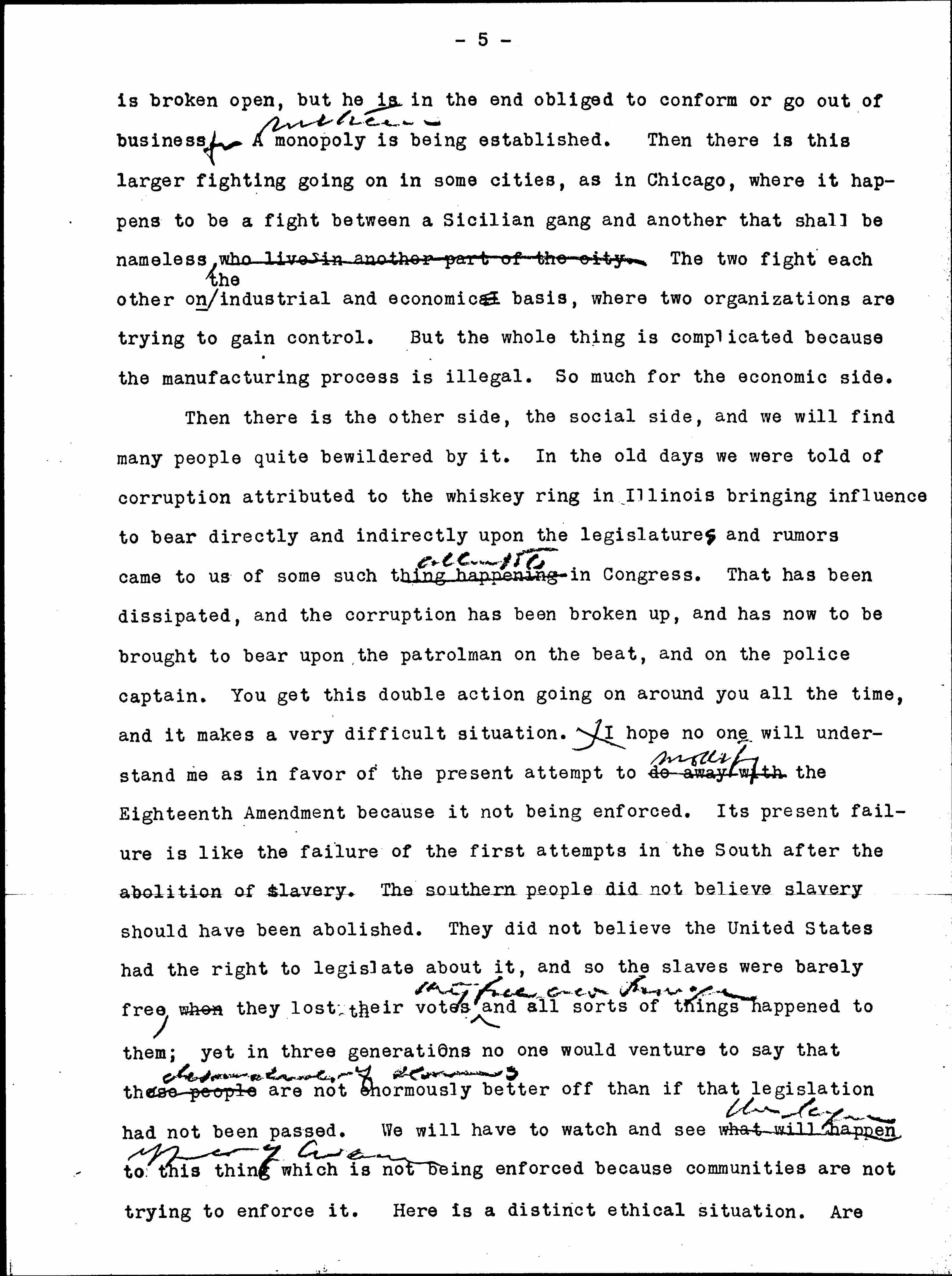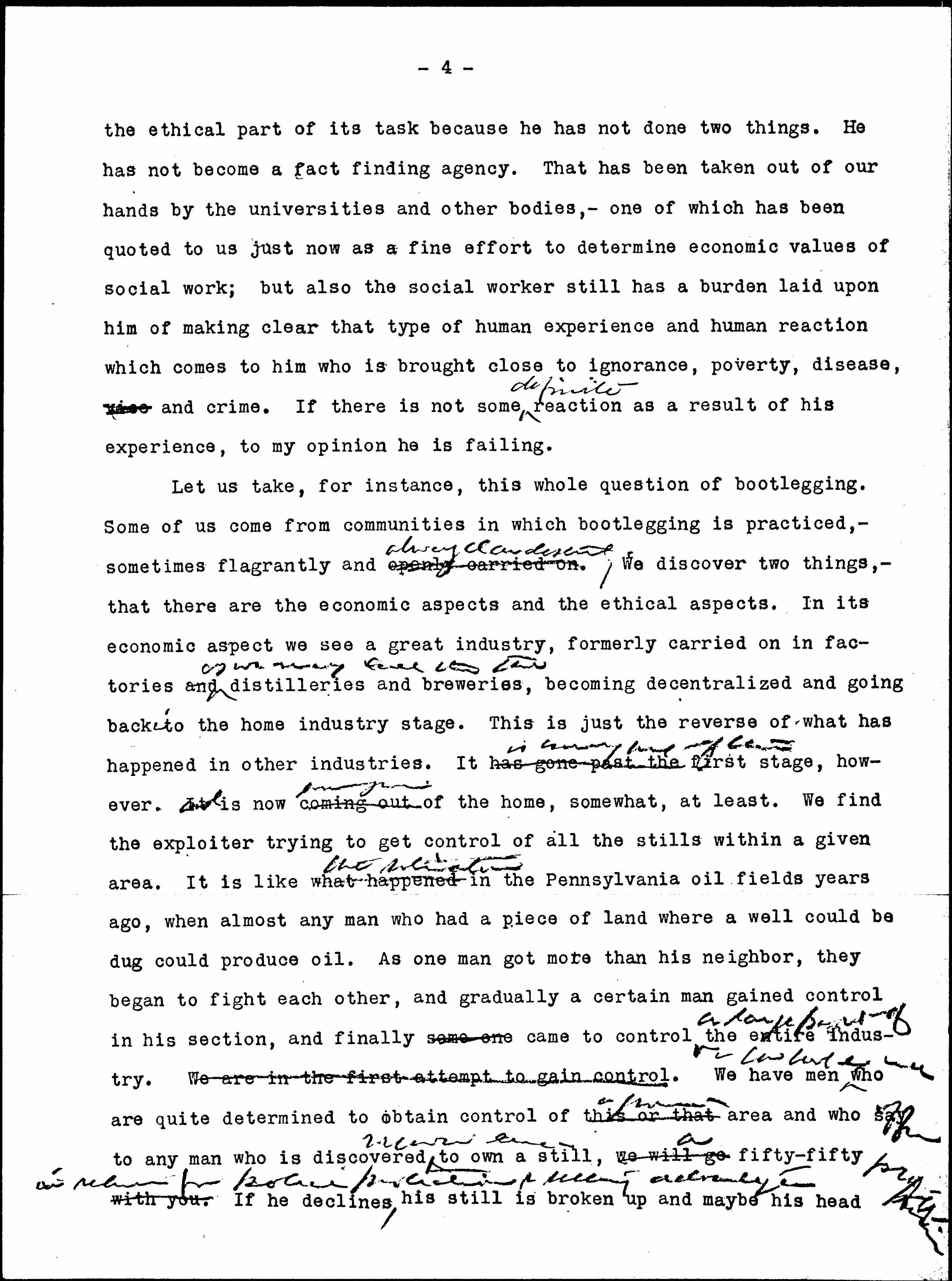 Let us take, for instance, this whole question of bootlegging. Some of us come from communities in which bootlegging is practiced, -- sometimes flagrantly and openly carried on ↑always [clandestinely]↓. We discover two things, -- that there are the economic aspects and the ethical aspects. In its economic aspect we see a great industry, formerly carried on in factories and ↑as we may feel that the↓ distilleries and breweries, becoming decentralized and going back ↑in↓ to the home industry stage. This is just the reverse of what has happened in other industries. It has gone past the ↑is [every?] part of this↓ first stage, however [it?] is now coming out ↑[everyone?]↓ of the home, somewhat, at least. We find the exploiter trying to get control of all the stills within a given area. It is like what happened ↑the situation↓ in the Pennsylvania oil fields years ago, when almost any man who had a piece of land where a well could be dug could produce oil. As one man got more than his neighbor, they began to fight each other, and gradually a certain man gained control in his section, and finally some one came to control ↑a large part of↓ the entire industry. We are in the first attempt to gain control. We have men ↑[illegible]↓ who are quite determined to obtain control of this or that ↑a [illegible]↓ area and who say ↑offer↓ to any man who is discovered ↑[illegible]↓ to own a still, we will go ↑a↓ fifty-fifty with you. If he declines, his still is broken up and maybe his head [page 5] is broken open, but he is in the end obliged to conform or go out of business ↑for↓ a ↑ruthless↓ monopoly is being established. Then there is this larger fighting going on in some cities, as in Chicago, where it happens to be a fight between a Sicilian gang and another that shall be nameless who lives in another part of the city. The two fight each other on ↑the↓ industrial and economic basis, where two organizations are trying to gain control. But the whole thing is complicated because the manufacturing process is illegal. So much for the economic side.
