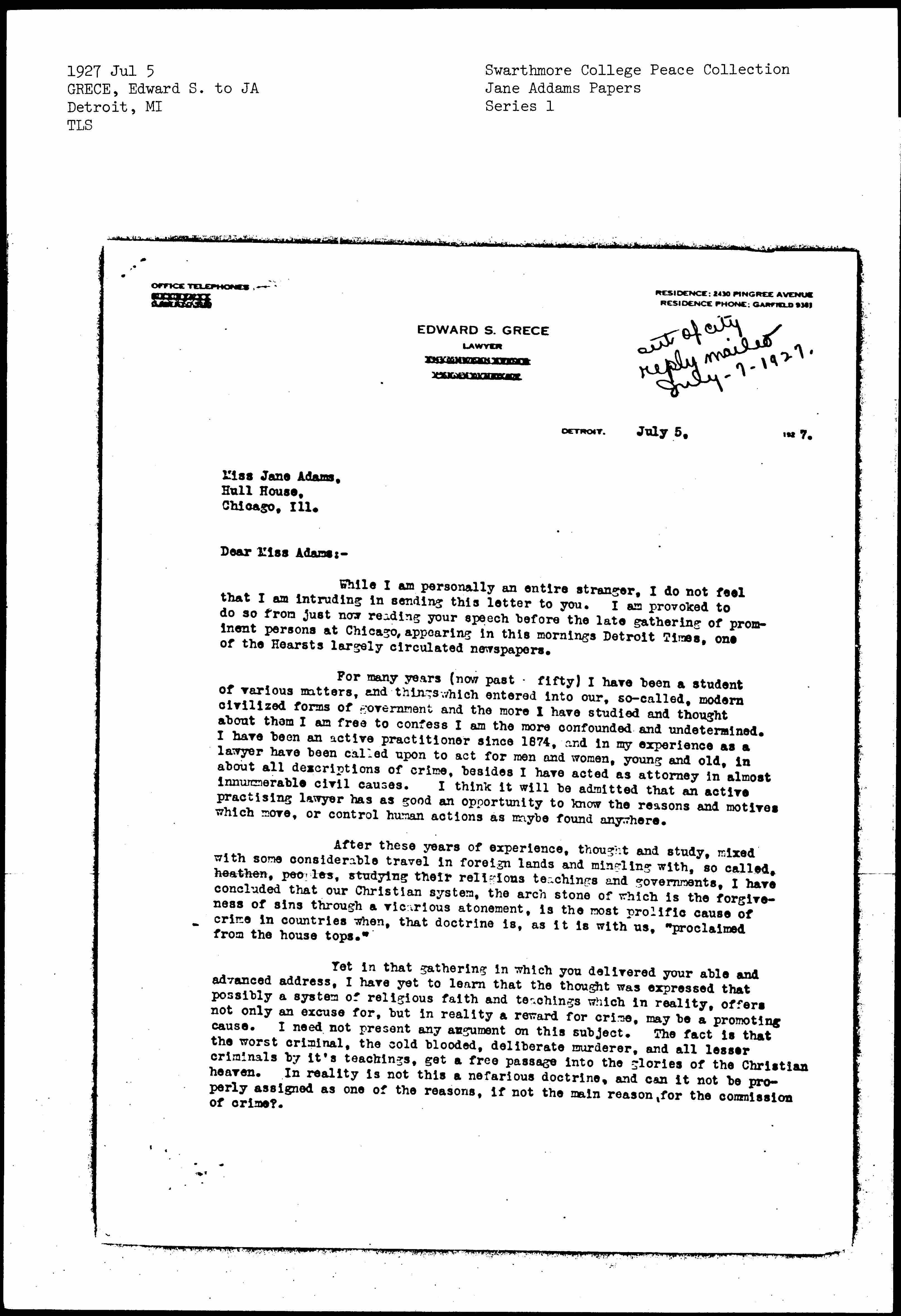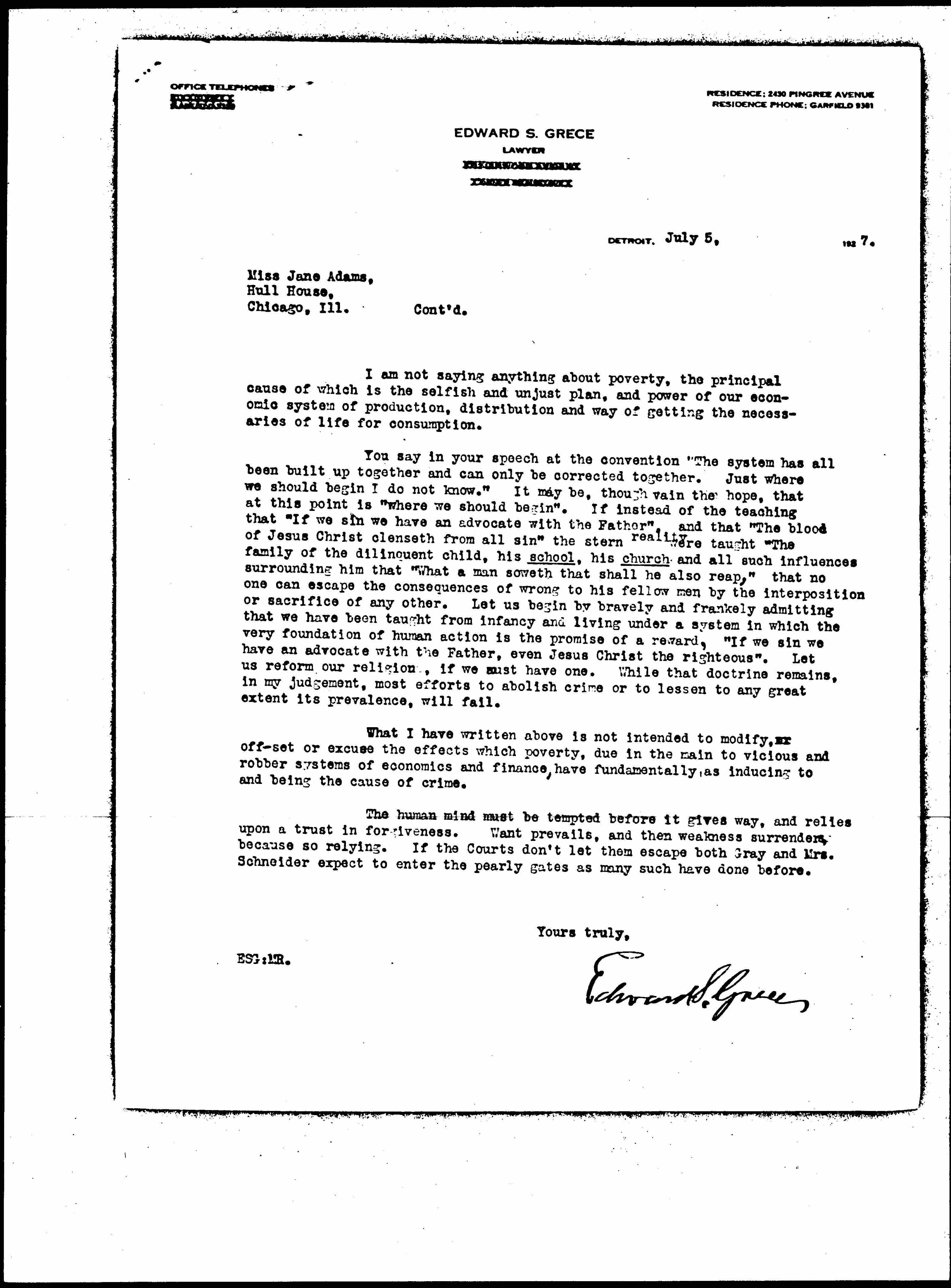You say in your speech at the convention "The system has all been built up together and can only be corrected together. Just where we should begin I do not know." It may be, though vain the hope, that at this point is "where we should begin." If instead of the teaching that "If we sin we have an advocate with the Father" and that "The Blood of Jesus Christ cleanseth from all sin" the stern reality were taught "The family of the [delinquent] child, his school, his church, and all such influences surrounding him that 'What a man soweth that shall he also reap,'" that no one can escape the consequences of wrong to his fellow men by the interposition or sacrifice of any other. Let us begin by bravely and [frankly] admitting that we have been taught from infancy and living under a system in which the very foundation of human action is the promise of a reward, "If we sin we have an advocate with the Father, even Jesus Christ the righteous." Let us reform our religion, if we must have one. While that doctrine remains, in my [judgment], most efforts to abolish crime or to lessen to any great extent its prevalence, will fail.