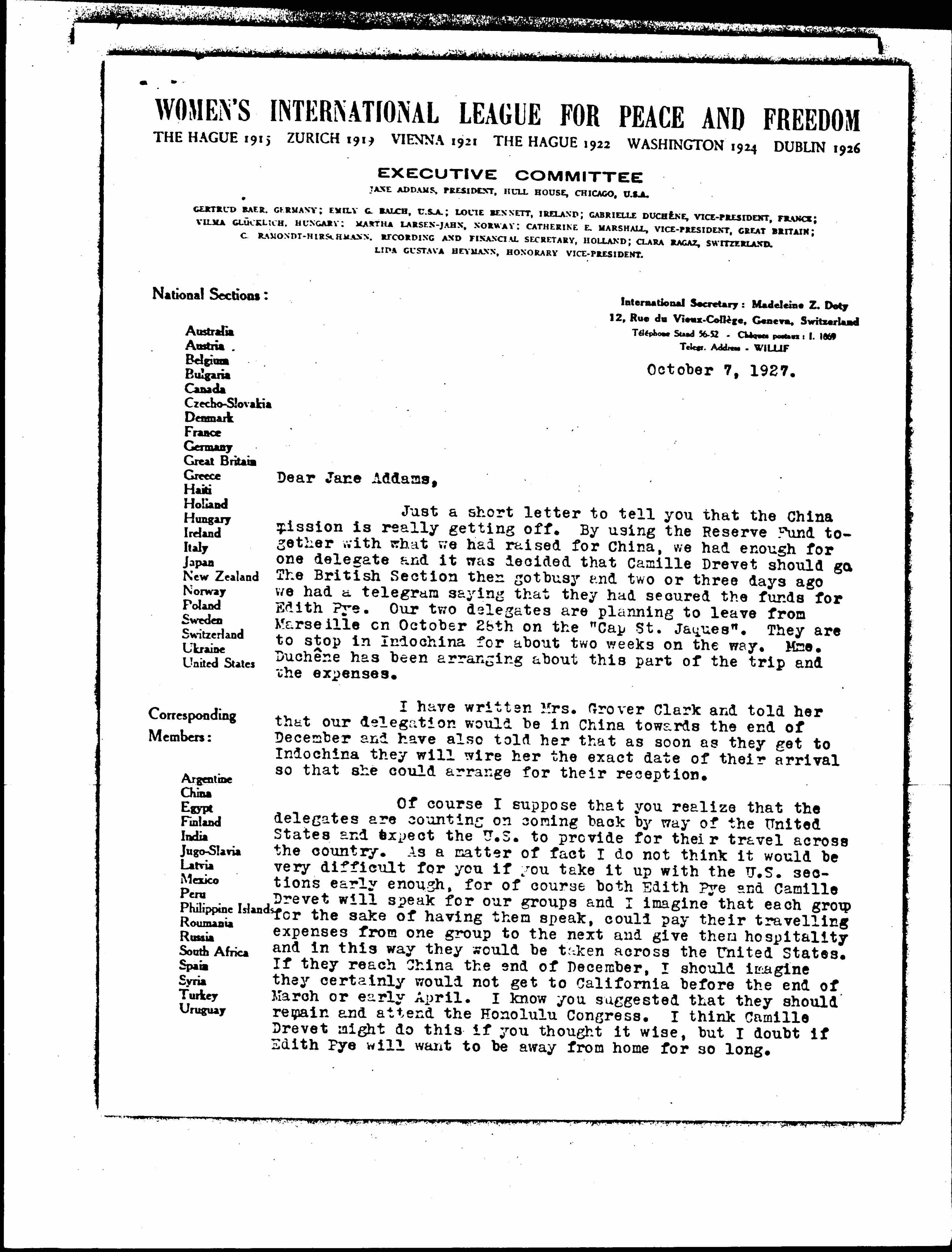 Just a short letter to tell you that the China mission is really getting off. By using the Reserve Fund together with what we had raised for China, we had enough for one delegate and it was decided that Camille Drevet should go. The British Section then got busy and two or three days ago we had a telegram saying that they had secured the funds for Edith Pye. Our two delegates are planning to leave from Marseille on October 28th on the "Cap St. [Jacques]." They are to stop in Indochina for about two weeks on the way. Mme. Duchêne has been arranging about this part of the trip and the expenses.