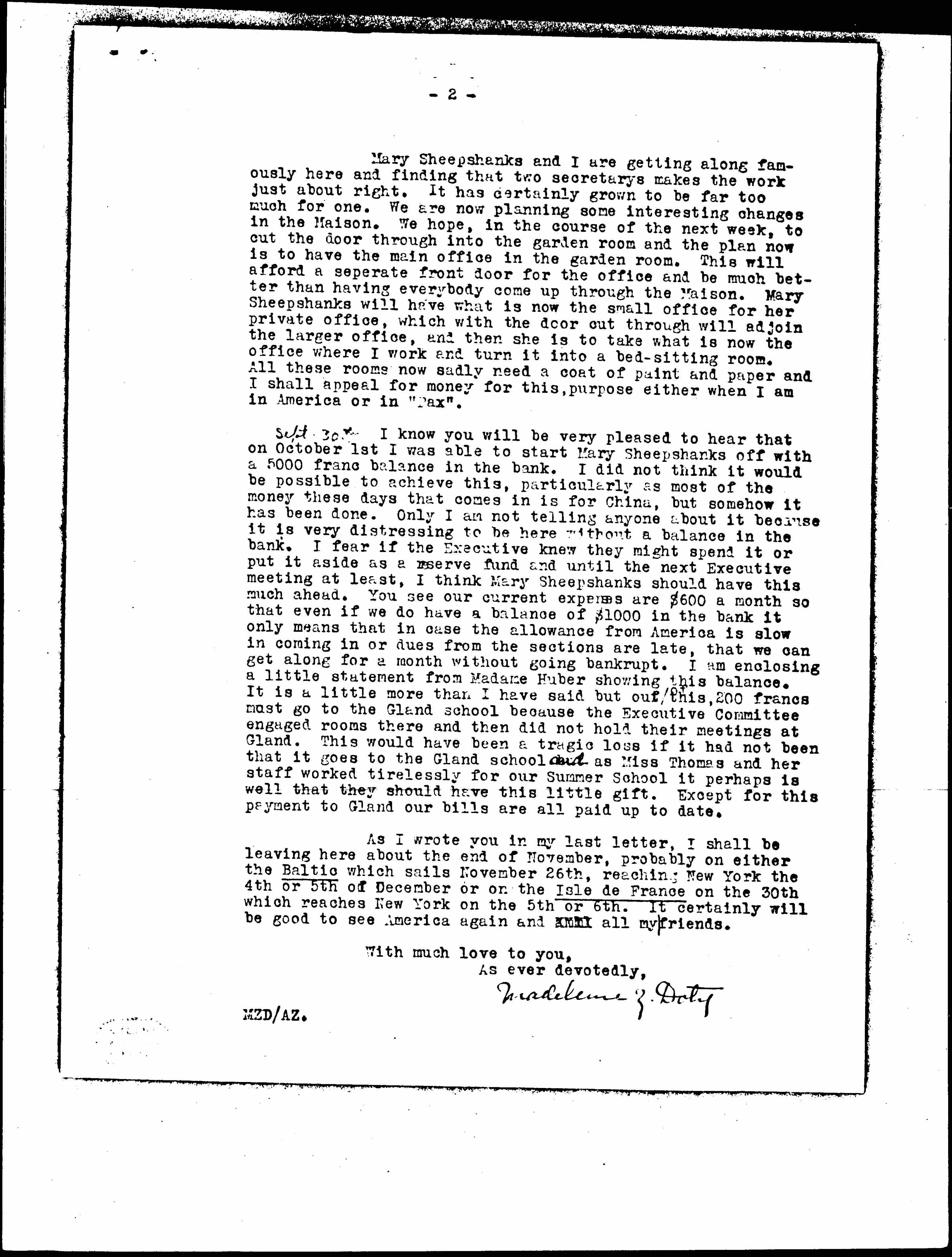 I know you will be very pleased to hear that on ↑Sept 30th↓ October 1st I was able to start Mary Sheepshanks off with a 5000 franc balance in the bank. I did not think it would be possible to achieve this, particularly as most of the money these days that comes in is for China, but somehow it has been done. Only I am not telling anyone about it because it is very distressing to be here without a balance in the bank. I fear if the Executive knew they might spend it or put it aside as a reserve fund and until the next Executive meeting at least, I think Mary Sheepshanks should have this much ahead. You see our current expenses are $600 a month so that even if we do have a balance of $1000 in the bank it only means that in case the allowance from America is slow in coming in or dues from the sections are late, that we can get along for a month without going bankrupt. I am enclosing a little statement from Madame Huber showing this balance. It is a little more than I have said but out ↑of↓ this, 200 francs must go to the Gland school because the Executive Committee engaged rooms there and then did not hold their meetings at Gland. This would have been a tragic loss if it had not been that it goes to the Gland school but ↑and↓ as Miss Thomas and her staff worked tirelessly for our Summer School it perhaps is well that they should have this little gift. Except for this payment to Gland our bills are all paid up to date.