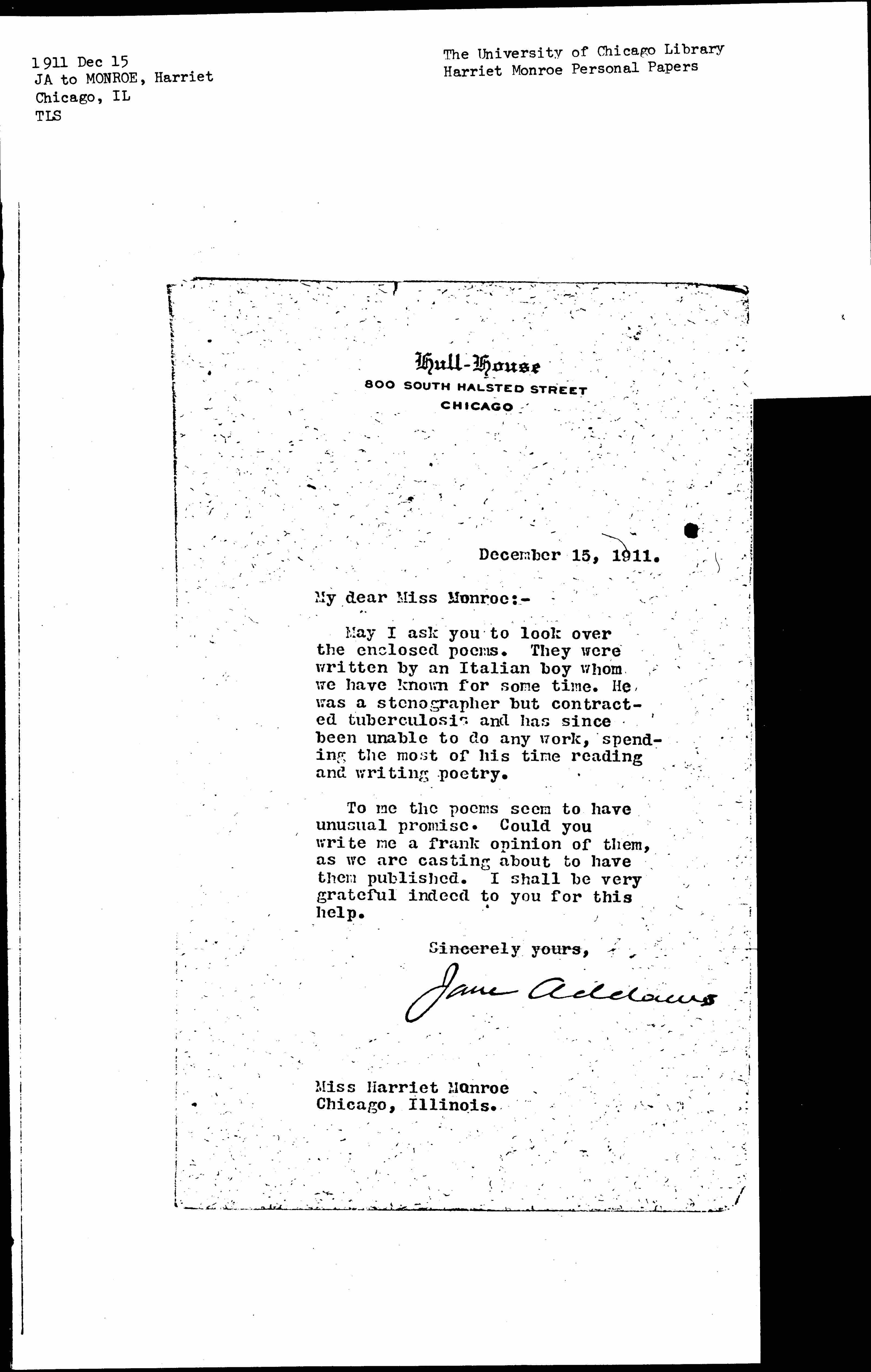 May I ask you to look over the enclosed poems. They were written by an Italian boy whom we have known for some time. He was a stenographer but contracted tuberculosis and has since been unable to do any work, spending the most of his time reading and writing poetry.