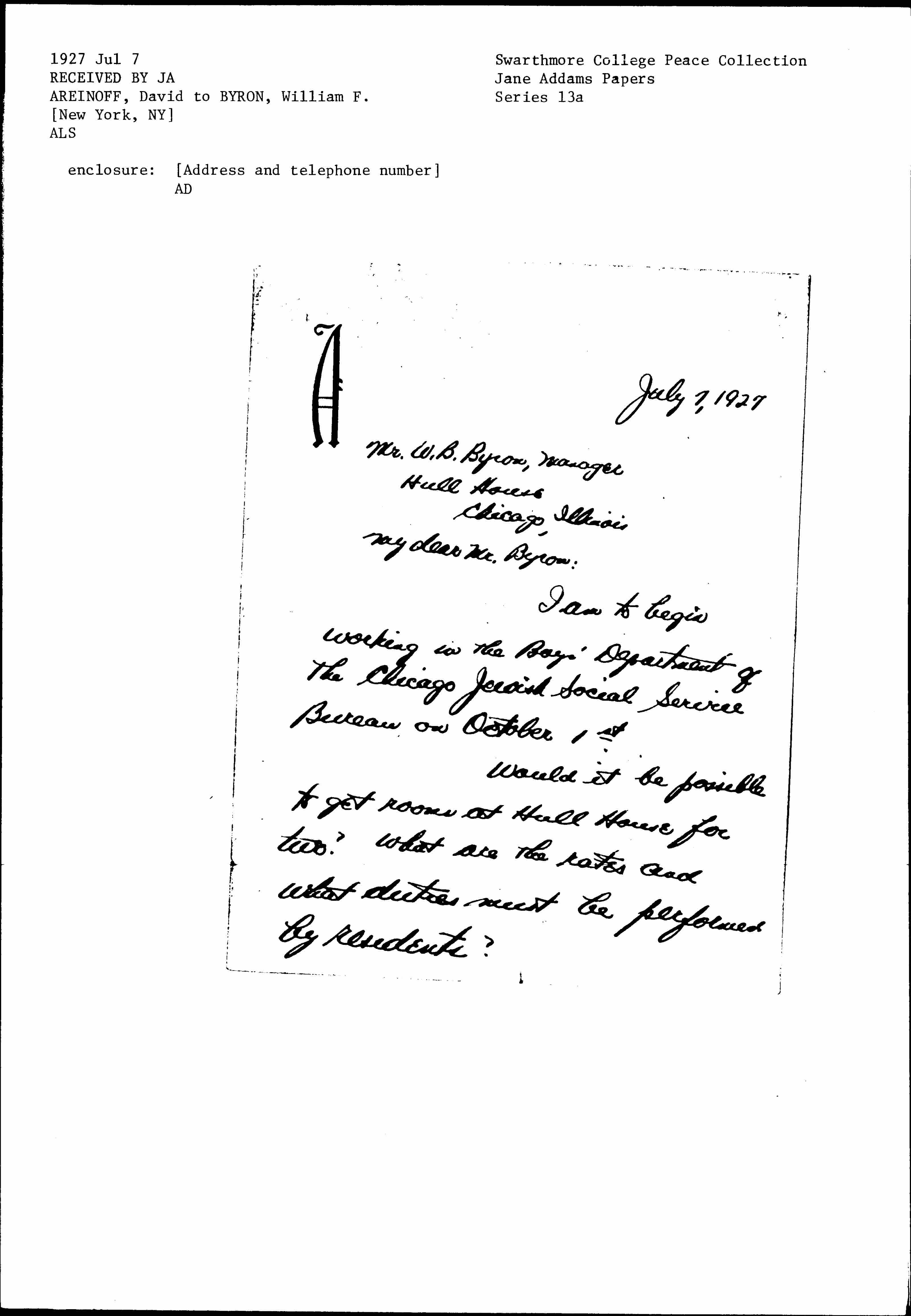 I would appreciate your letting me know about these matters as I wish live at some settlement while in Chicago.