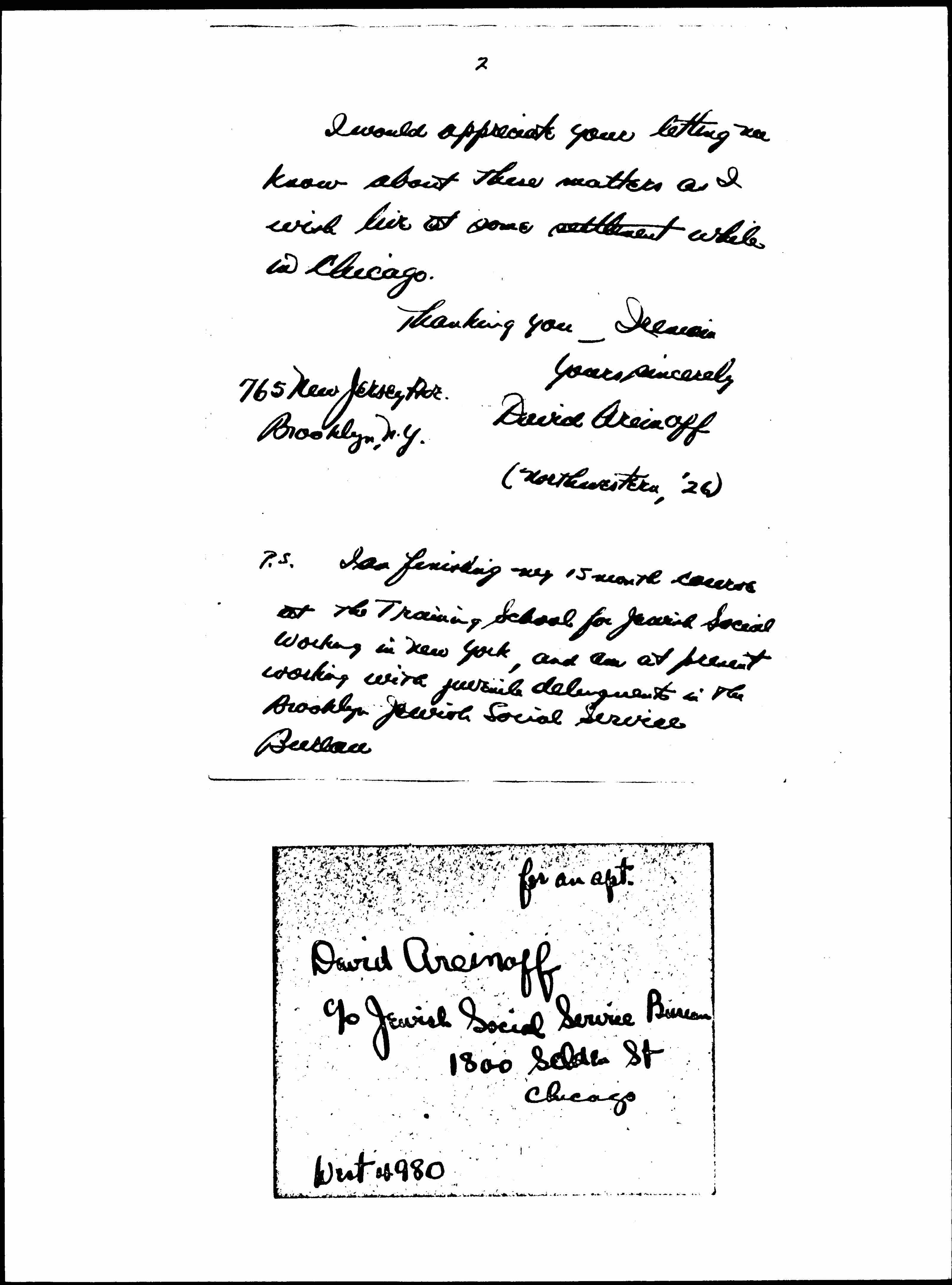 P.S. I am finishing my 15 month course at the Training School for Jewish Social working in New York, and am at present working with juvenile delinquents in the Brooklyn Jewish Social Service Bureau. [page 3]
