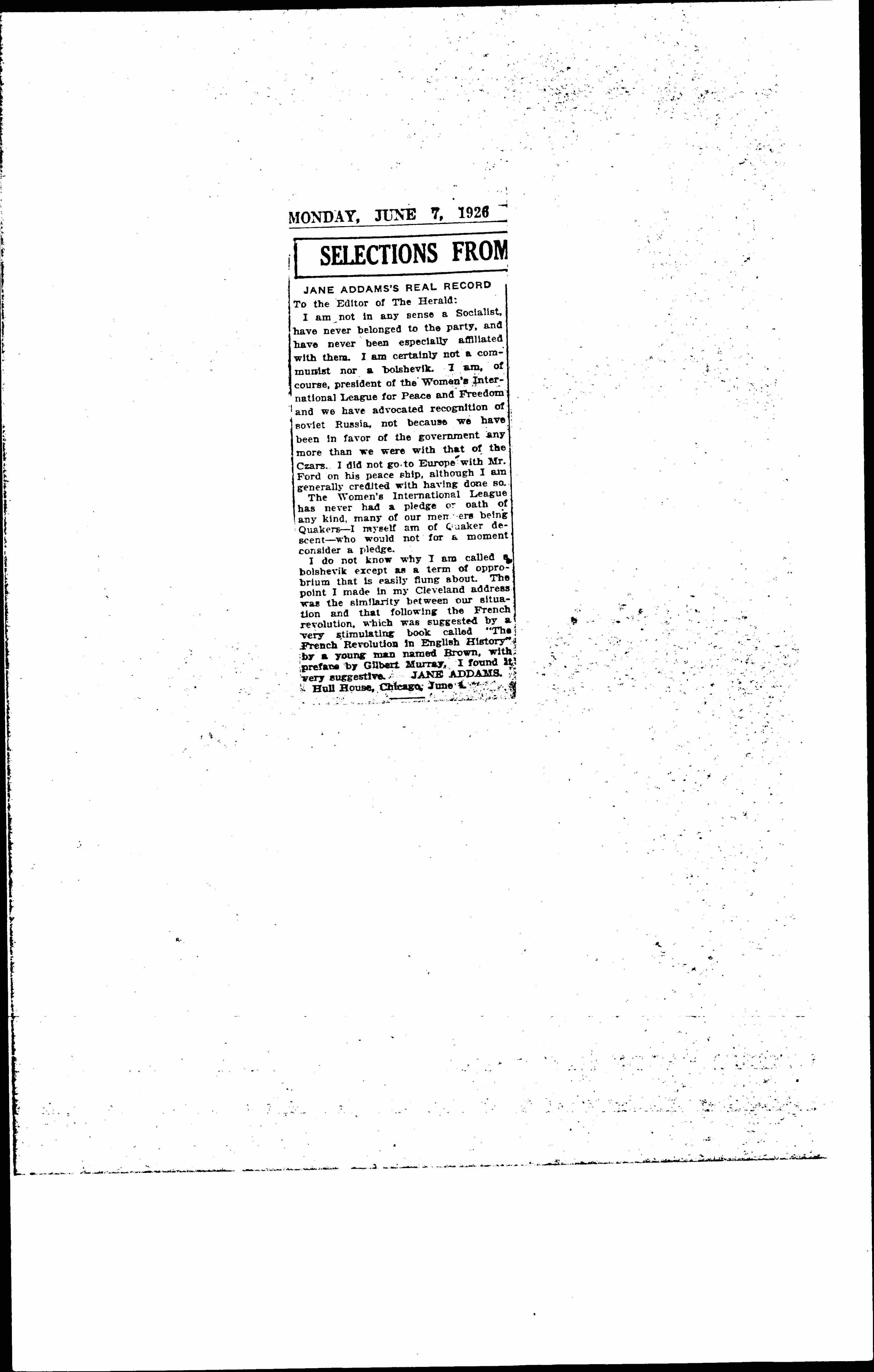 I do not know why I am called a bolshevik except as a term of opprobrium that is easily flung about. The point I made in my Cleveland address was the similarity between our situation and that following the French revolution, which was suggested by a very stimulating book called “The French Revolution in English History” by a young man named Brown, with preface by Gilbert Murray. I found it very suggestive. JANE ADDAMS.