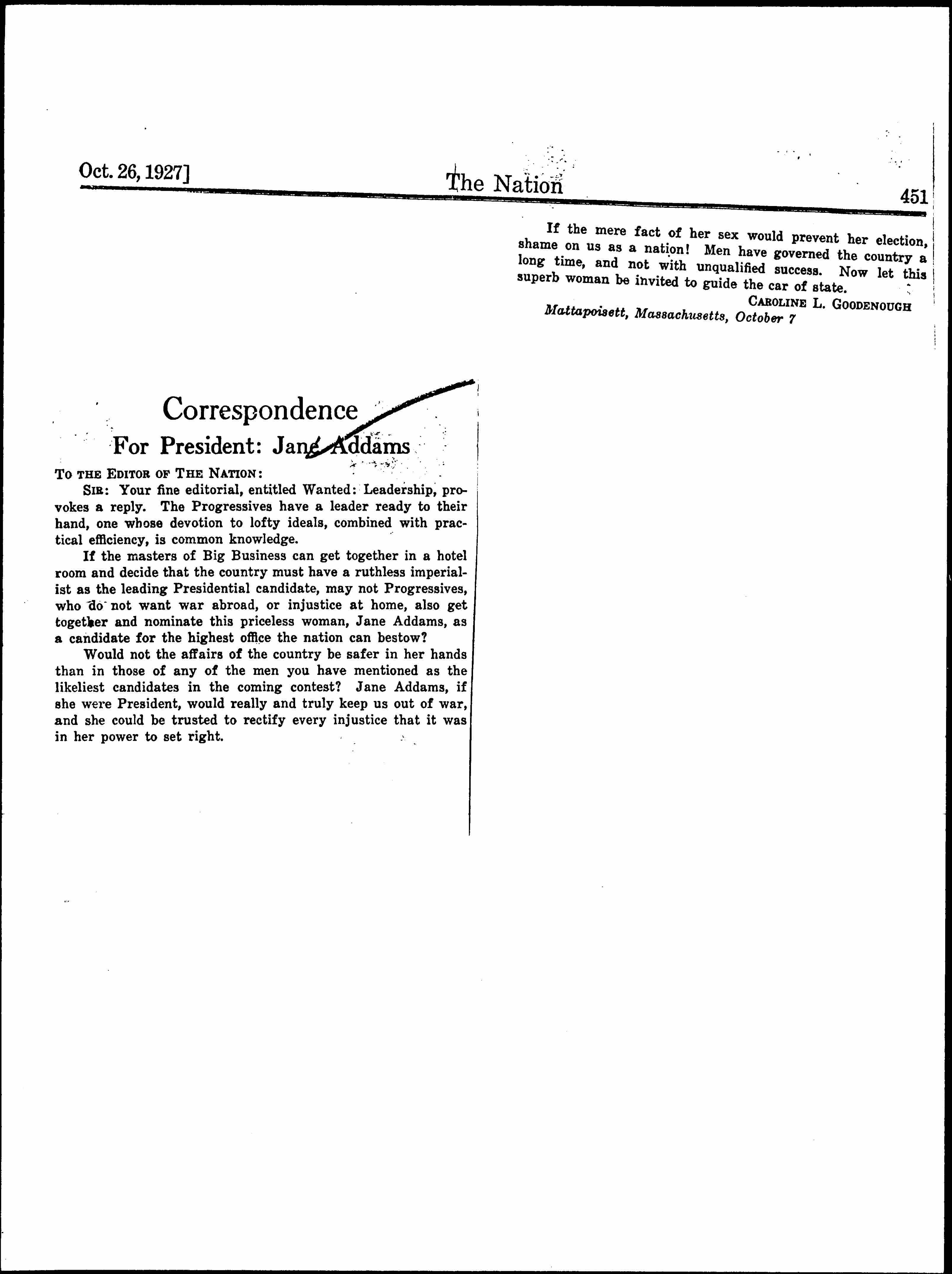 Caroline Goodenough to the Editor of the Nation, October 7, 1927