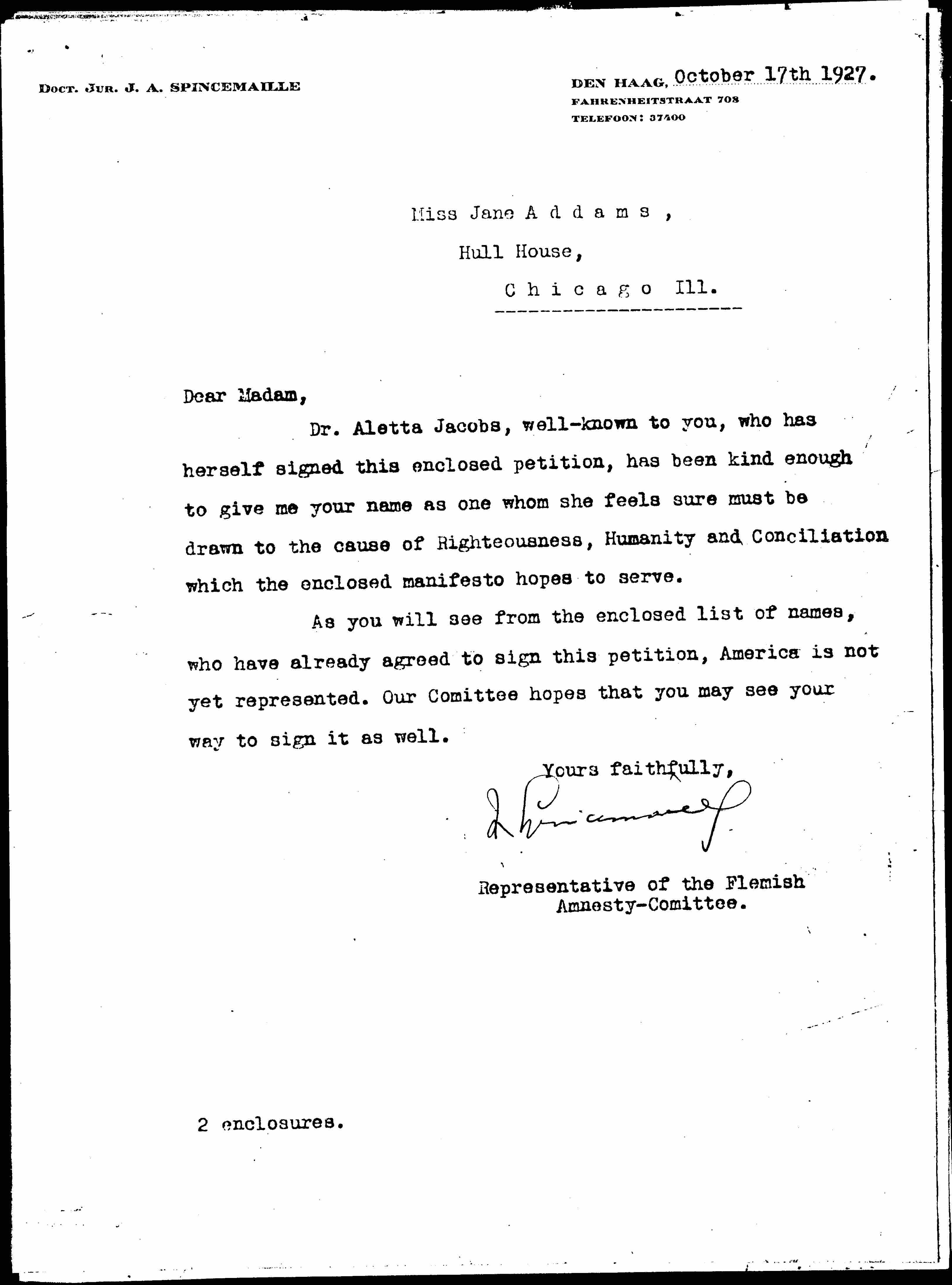 Dr. Aletta Jacobs, well-known to you, who has herself signed this enclosed petition, has been kind enough to give me your name as one whom she feels sure must be drawn to the cause of Righteousness, Humanity and Conciliation which the enclosed manifesto hopes to serve.