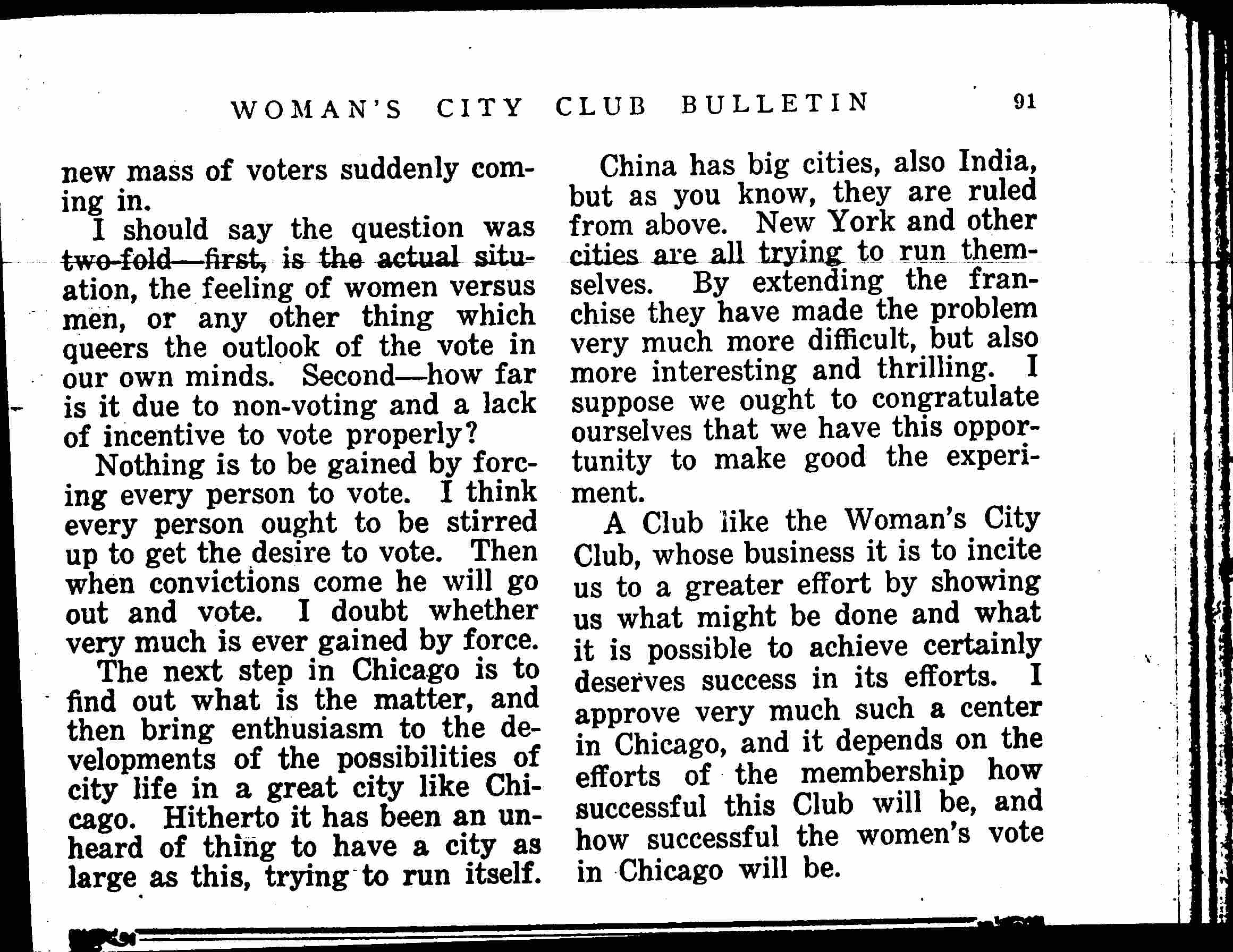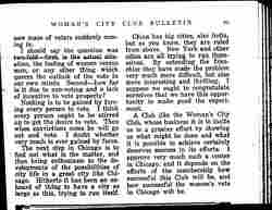 A Club like the Woman's City Club, whose business it is to incite us to a greater effort by showing us what might be done and what it is possible to achieve certainly deserves success in its efforts. I approve very much such a center in Chicago, and it depends on the efforts of the membership how successful this Club will be, and how successful the women's vote in Chicago will be.