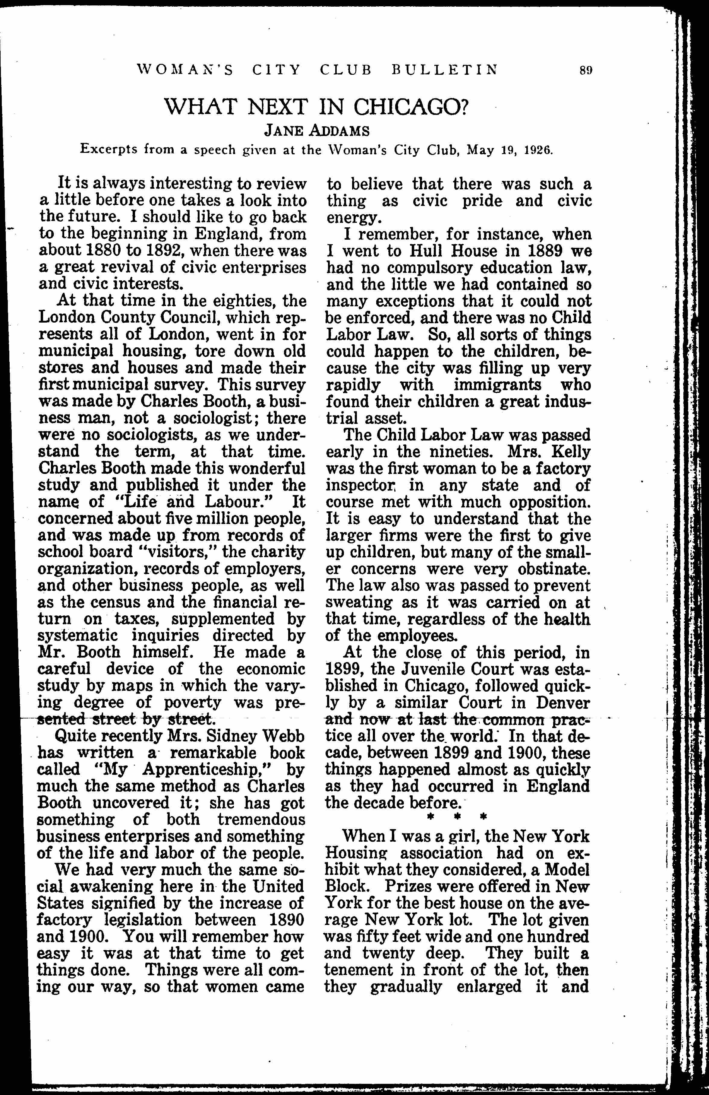 Excerpts from a speech given at the Woman's City Club, May 19, 1926.