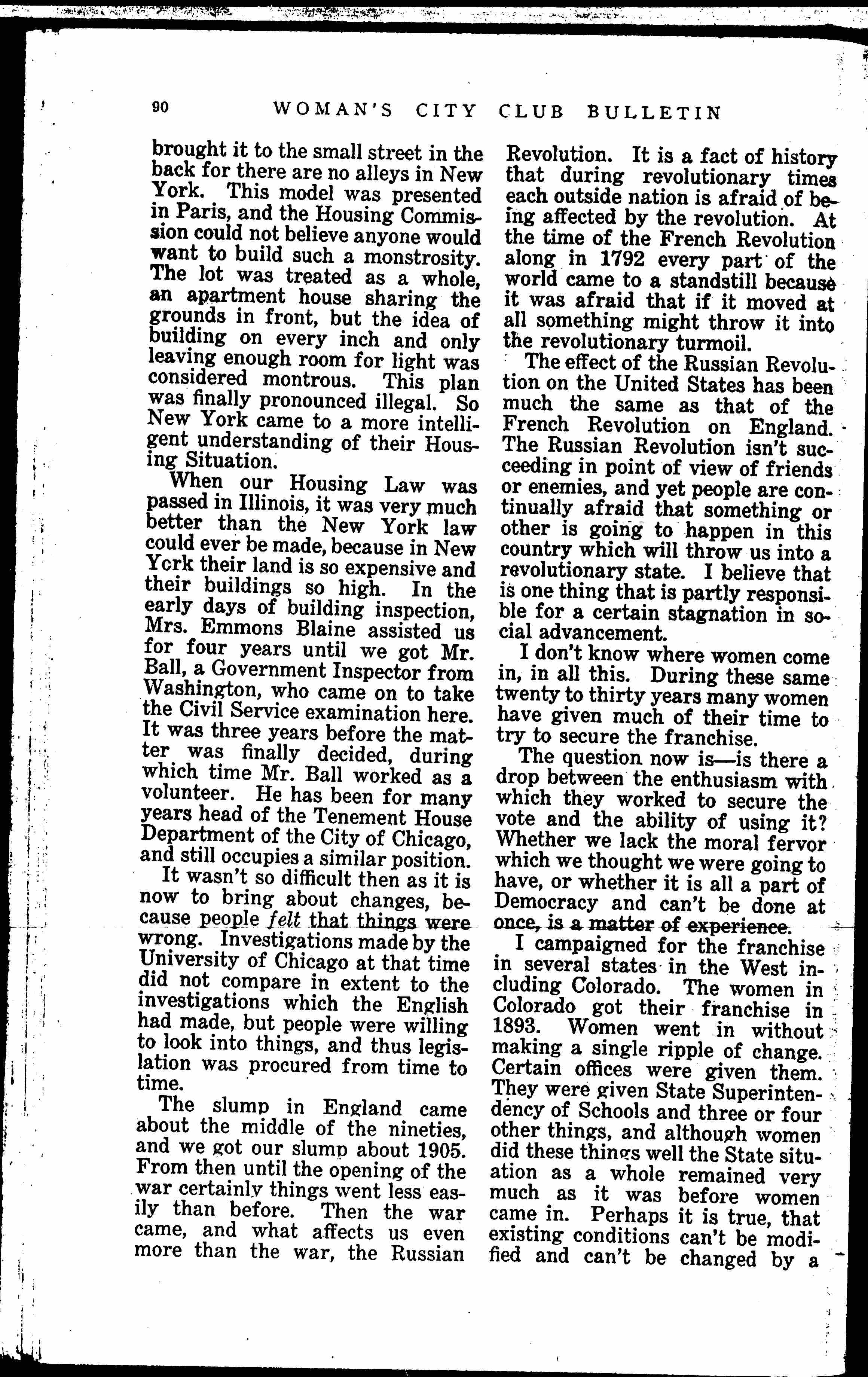 I campaigned for the franchise in several states in the West including Colorado. The women in Colorado got their franchise in 1893. Women went in without making a single ripple of change. Certain offices were given them. They were given State Superintendency of Schools and three or four other things, and although women did these things well the State situation as a whole remained very much as it was before women came in. Perhaps it is true, that existing conditions can't be modified and can't be changed by a [page 3] new mass of voters suddenly coming in.