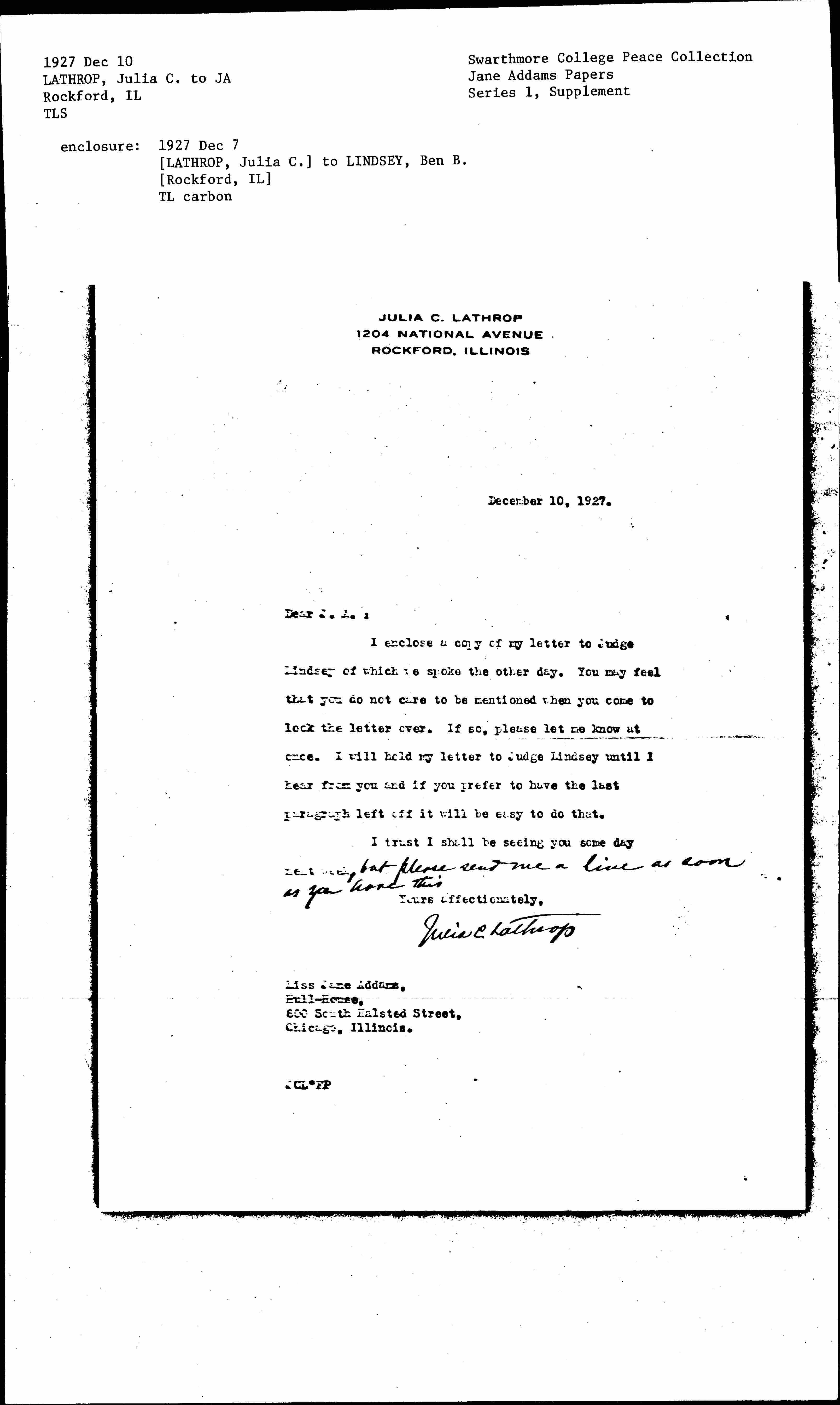 Julia Clifford Lathrop to Benjamin Barr Lindsey, December 7, 1927