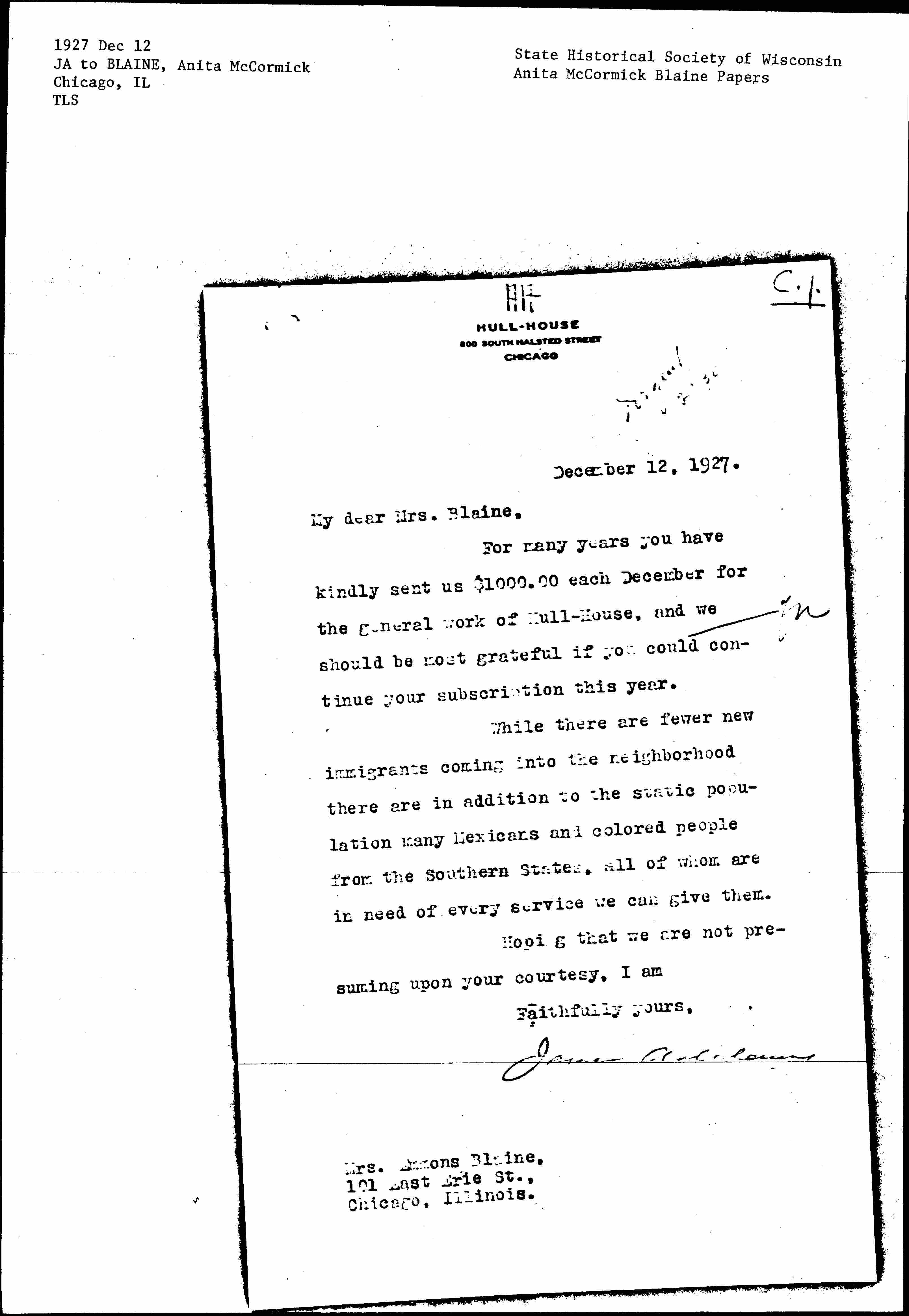 Jane Addams to Anita McCormick Blaine, December 12, 1927