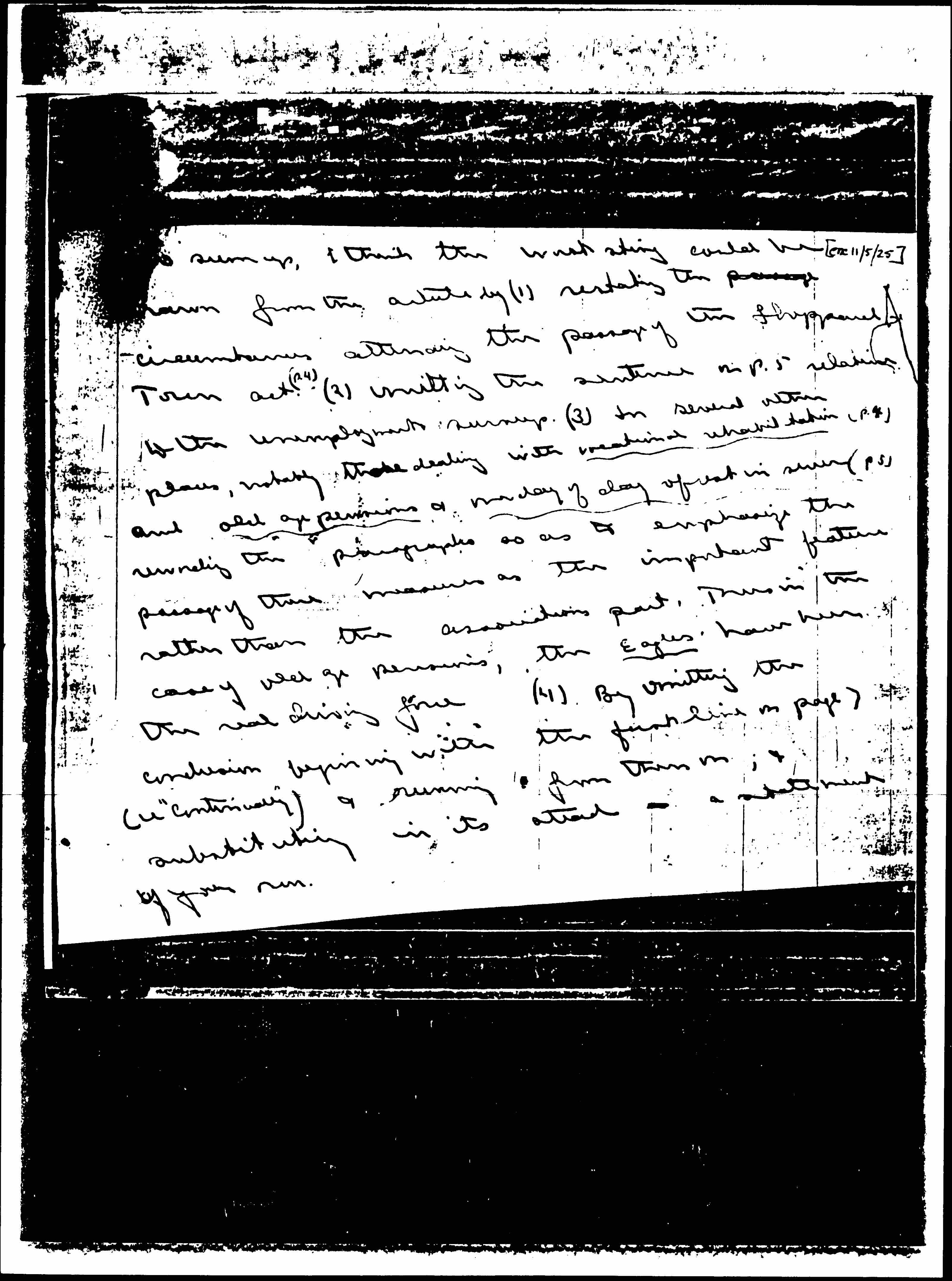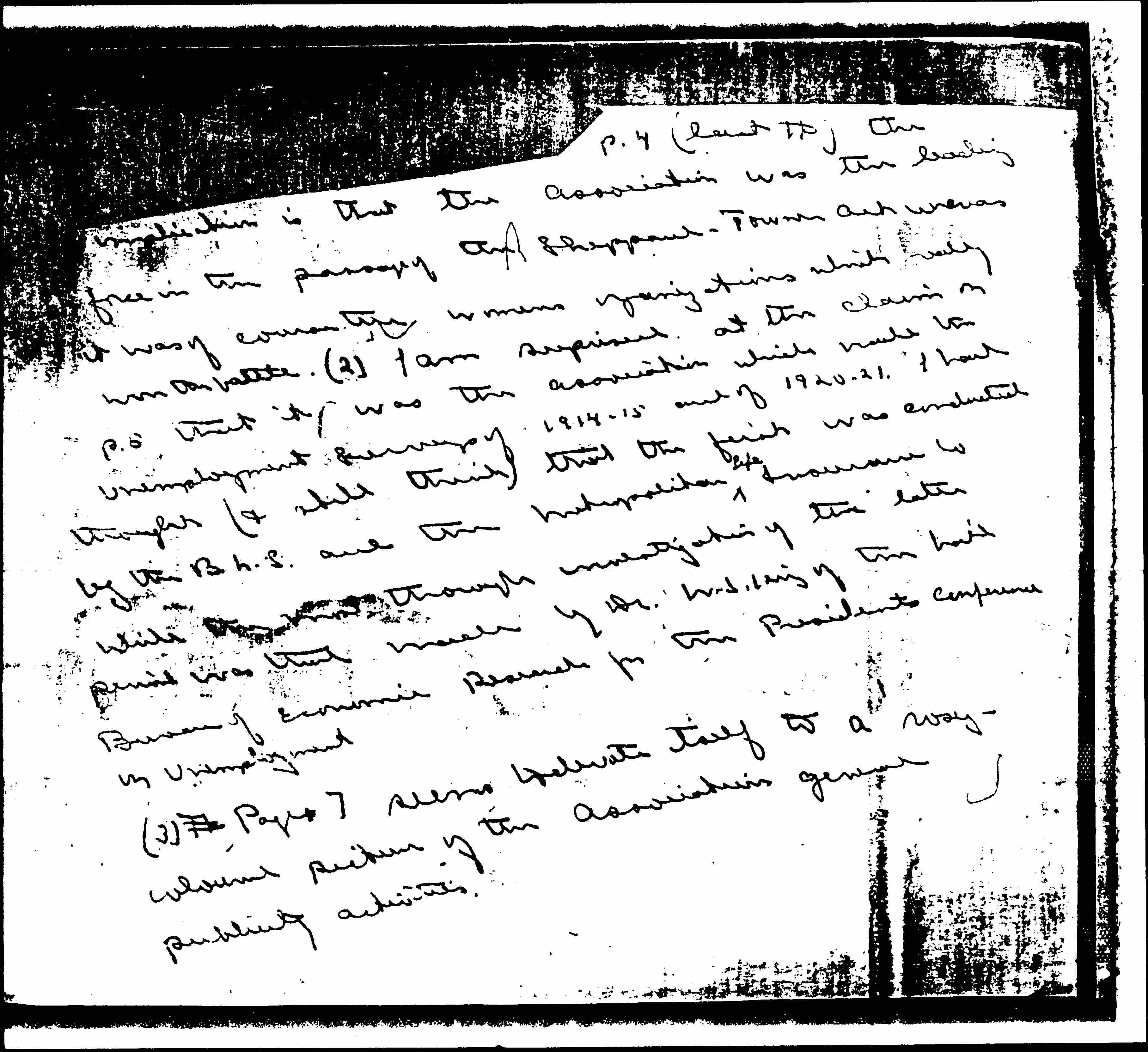 p. 4 (last ¶) the implication is that the Association was the leading force in the passage of the Sheppard-Towner Act whereas it was of course the womens organizations which really won the battle. (2) I am surprised at the claims on p. 5 that it was the association which made the unemployment hearings of 1914-15 and of 1920-21. I had thought (& still think) that the first was conducted by the B.L.S. and the Metropolitan ↑Life↓ Insurance Co while [illegible] through investigations of the later period was that work by Dr. [illegible] of the Nat'l Bureau of Economic Research for the President's Conference on Unemployment.