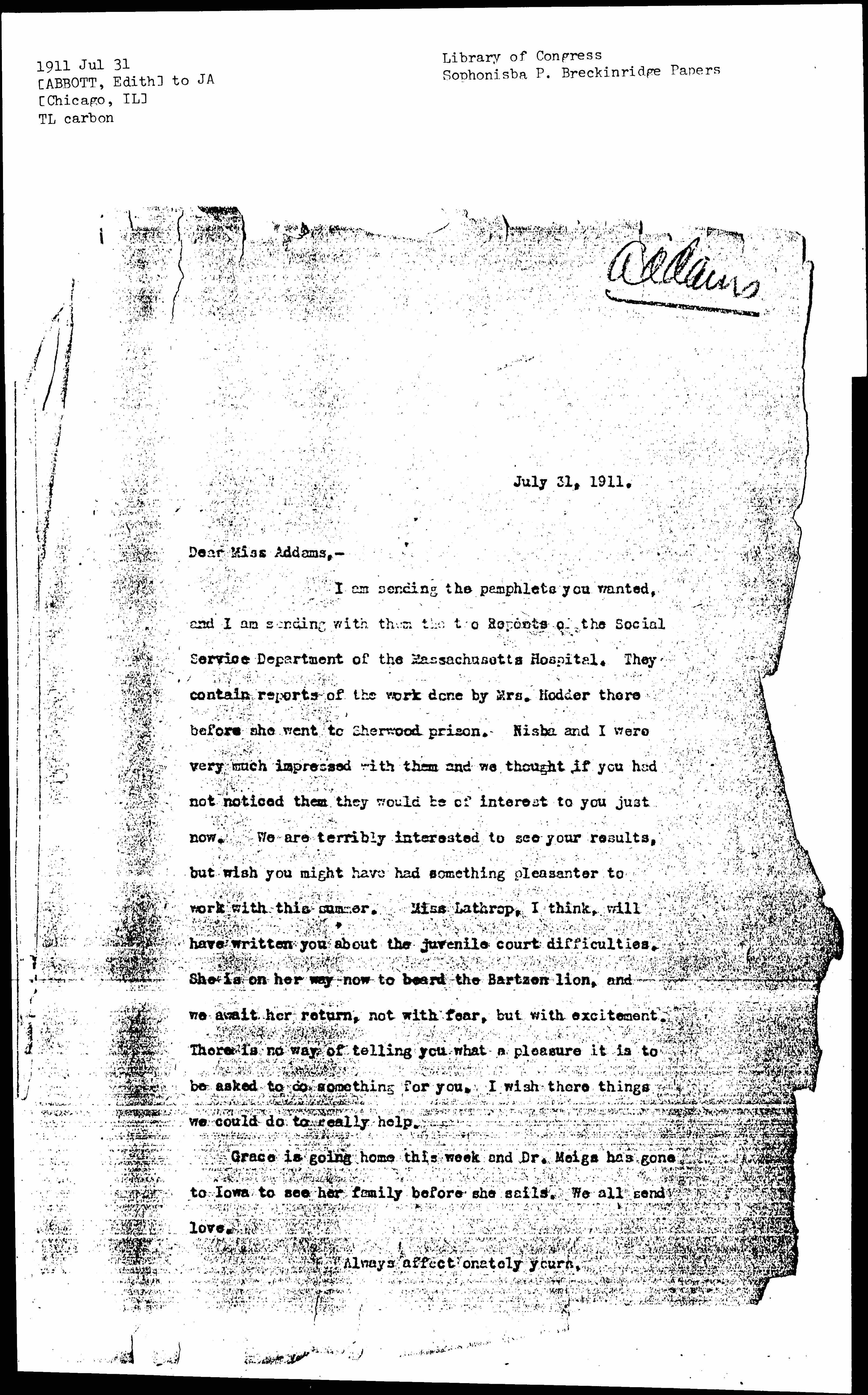 I am sending the pamphlets you wanted, and I am sending with them the two Reports of the Social Service Department of the Massachusetts Hospital. They contain reports of the work done by Mrs. Hodder there before she went to Sherwood prison. Nisba and I were very much impressed with them and we thought if you had not noticed them they would be of interest to you just now. We are terribly interested to see your results, but wish you might have had something pleasanter to work with this summer. Miss Lathrop, I think, will have written you about the juvenile court difficulties. She is on her way now to board the Bartzen lion, and we await her return, not with fear, but with excitement. There is no way of telling you what a pleasure it is to be asked to do something for you, I wish there things we could do to really help.