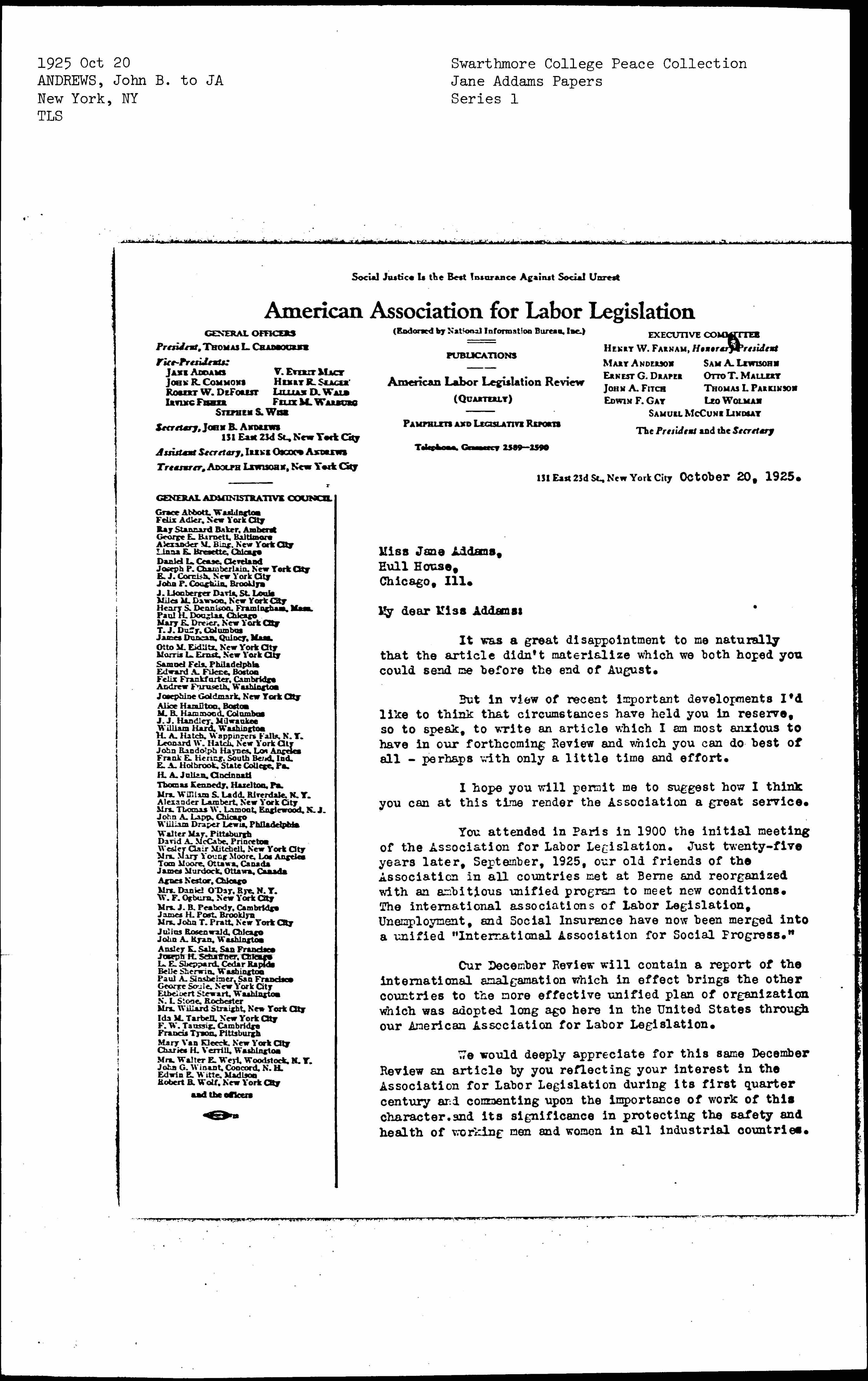 We would deeply appreciate for this same December Review an article by you reflecting your interest in the Association for Labor Legislation during its first quarter century and commenting upon the importance of work of this character and its significance in protecting the safety and health of working men and women in all industrial countries. [page 2]