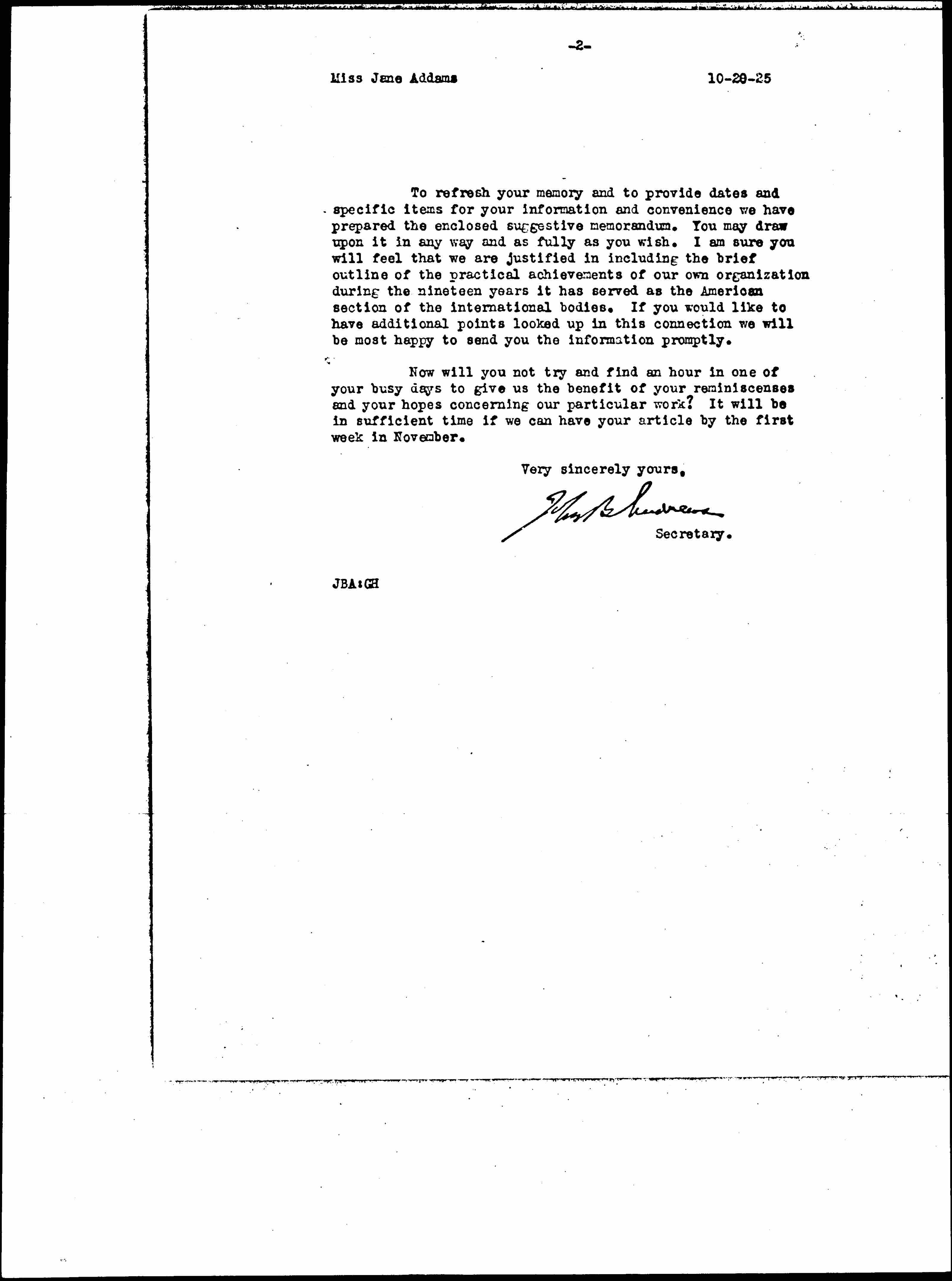 Now will you not try and find an hour in one of your busy days to give us the benefit of your reminiscences and your hopes concerning our particular work? It will be in sufficient time if we can have your article by the first week in November.