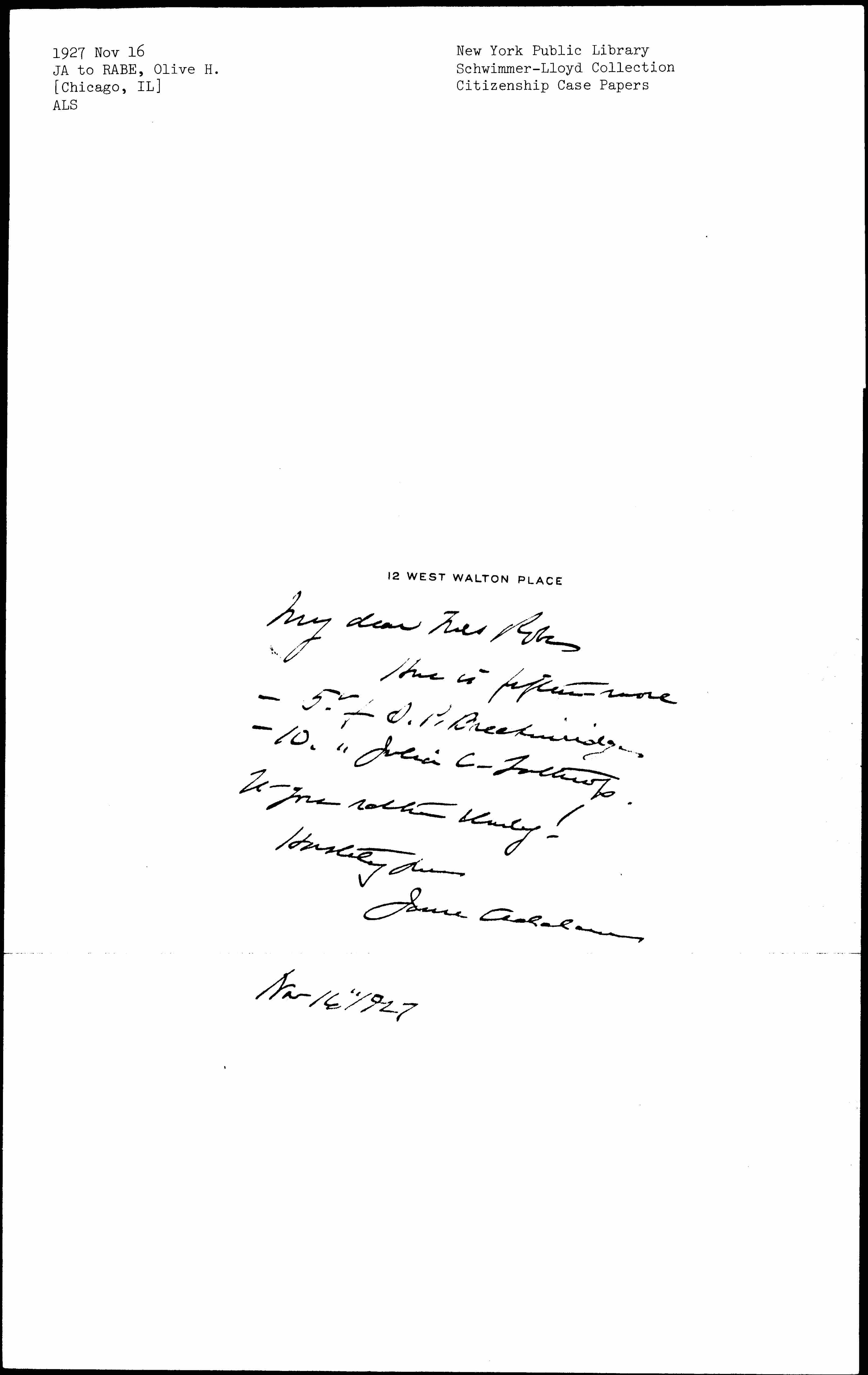 Jane Addams to Olive Hansen Rabe, November 16, 1927
