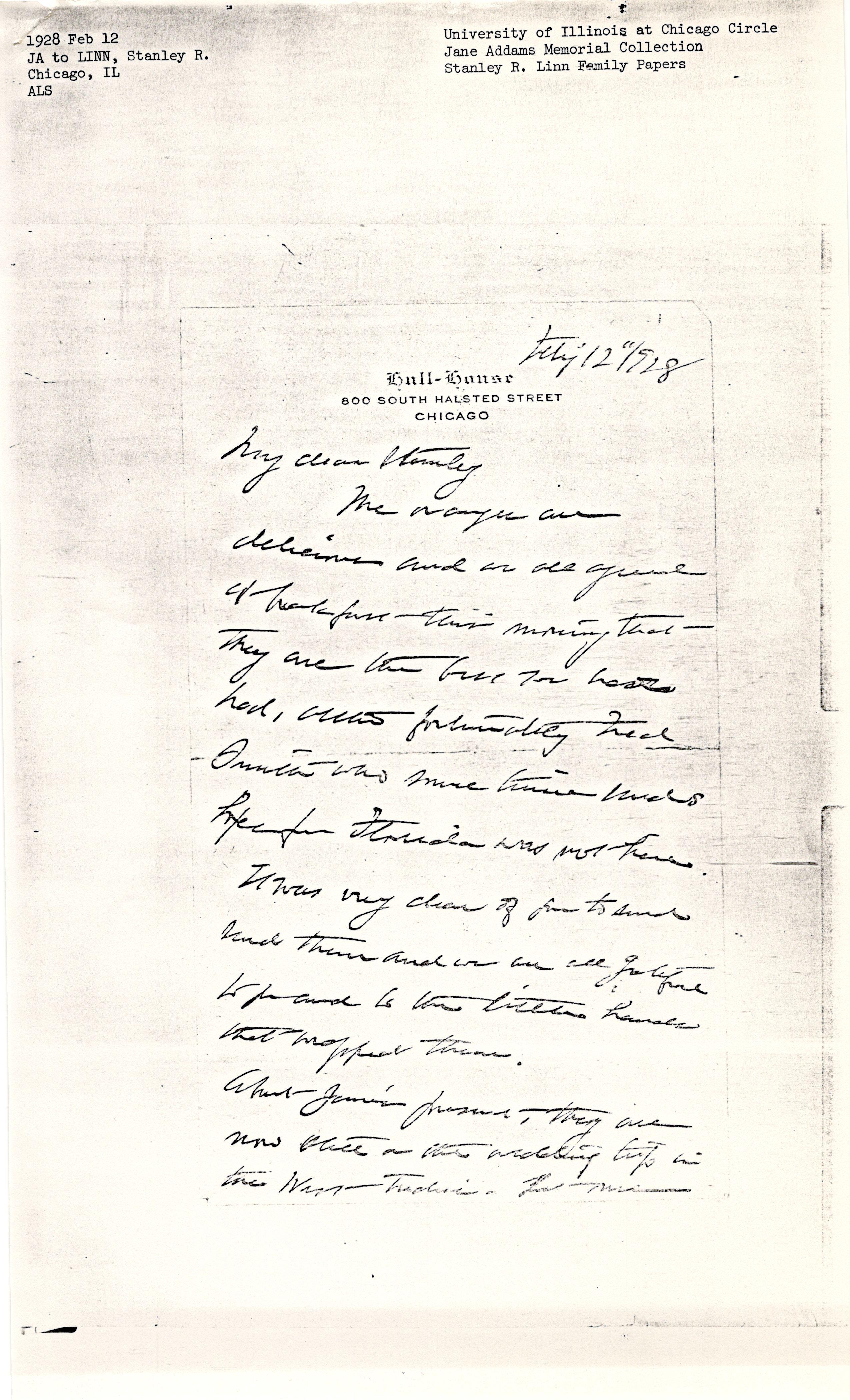 Jane Addams to Stanley Ross Linn, February 12, 1928