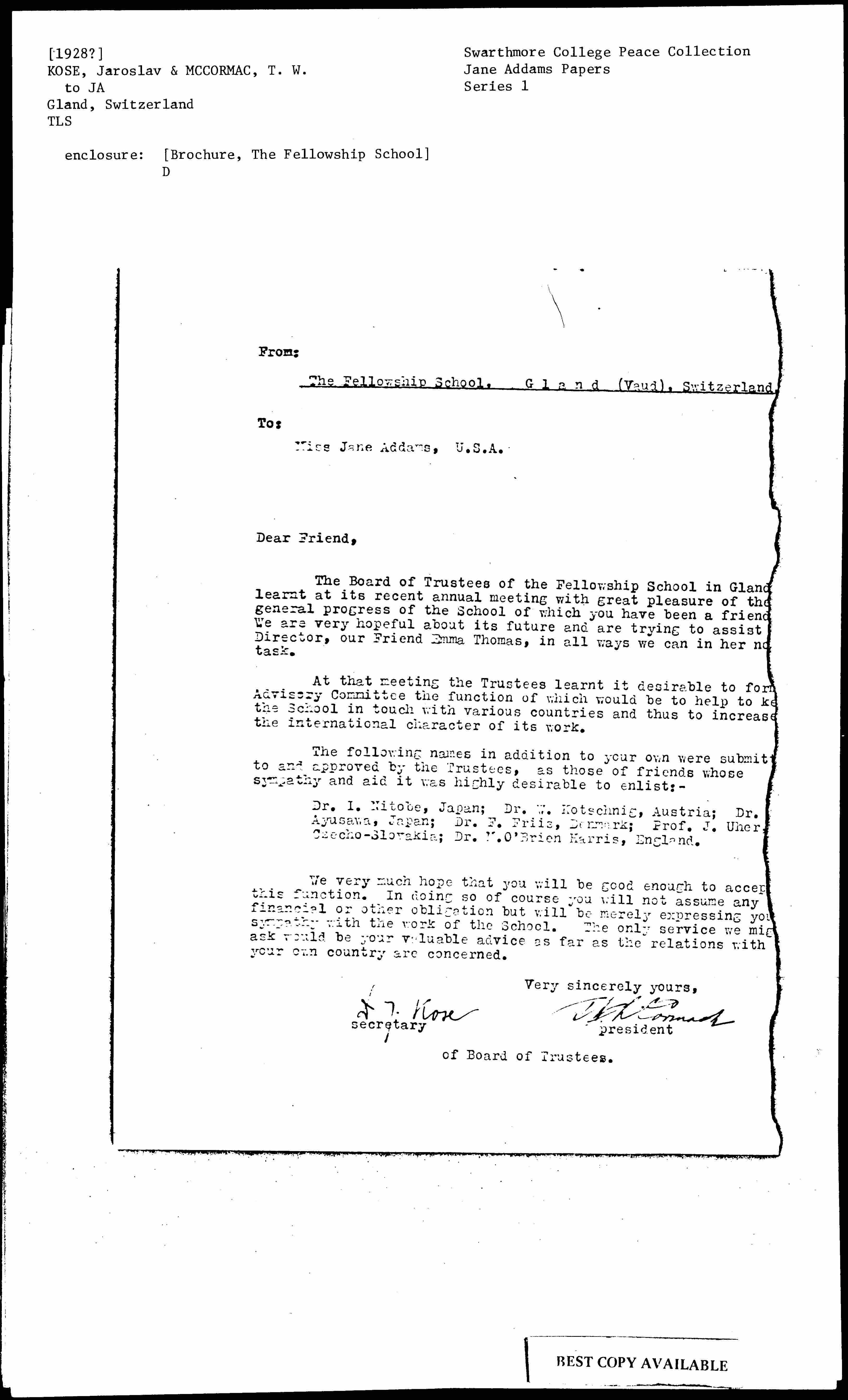 Jaroslav Kose and Thomas William McCormack to Jane Addams, ca. 1928