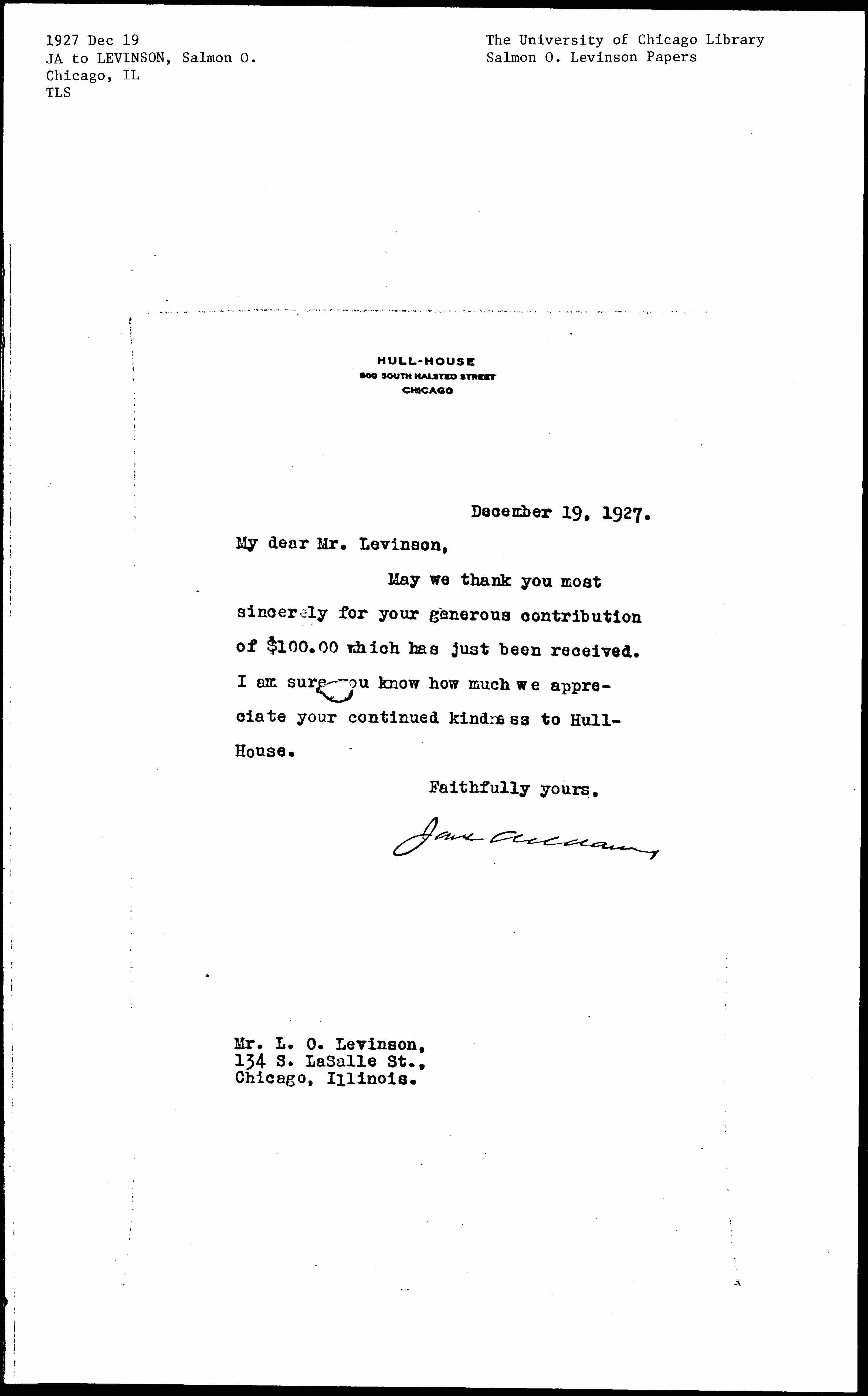 Jane Addams to Salmon Oliver Levinson, December 19, 1927