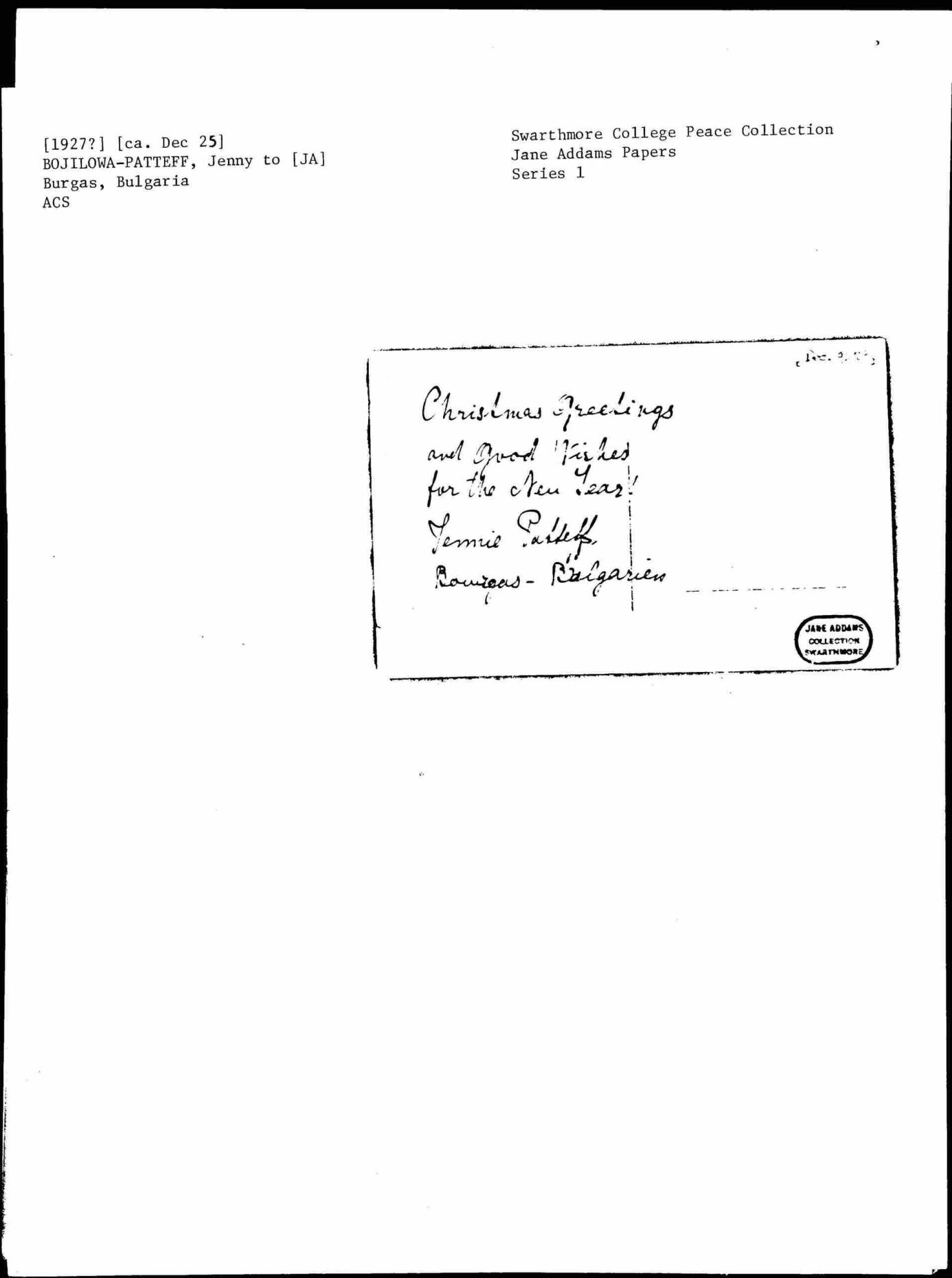 Jeni Bojilowa-Patteva to Jane Addams, December 25, 1927