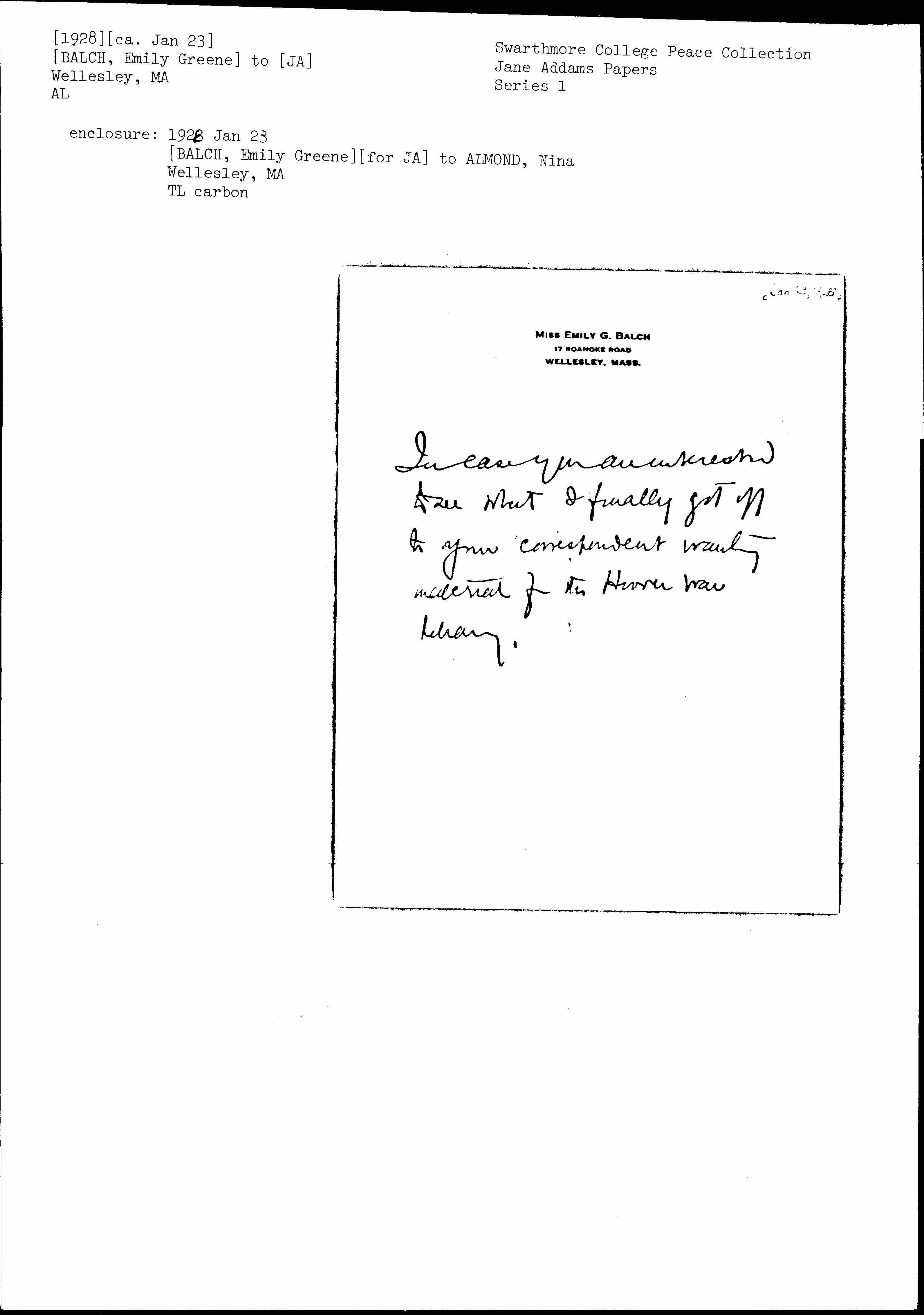 Emily Greene Balch to Nina E. Almond, January 23, 1928