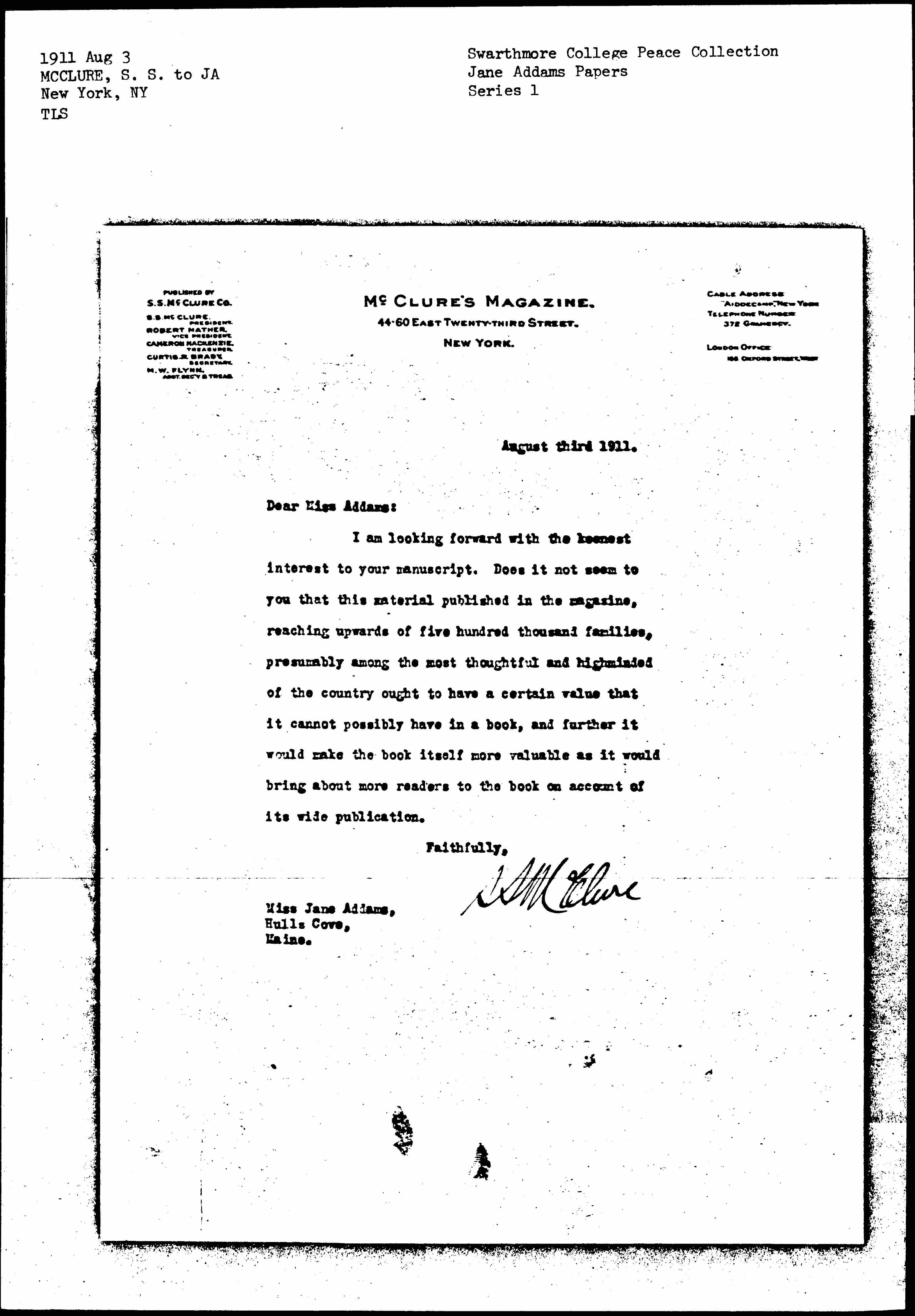 I am looking forward with the keenest interest to your manuscript. Does it not seem to you that this material published in the magazine, reaching upwards of five hundred thousand families, presumably among the most thoughtful and [high minded] of the country ought to have a certain value that it cannot possibly have in a book, and further it would make the book itself more valuable as it would bring about more readers to the book on account of its wide publication.