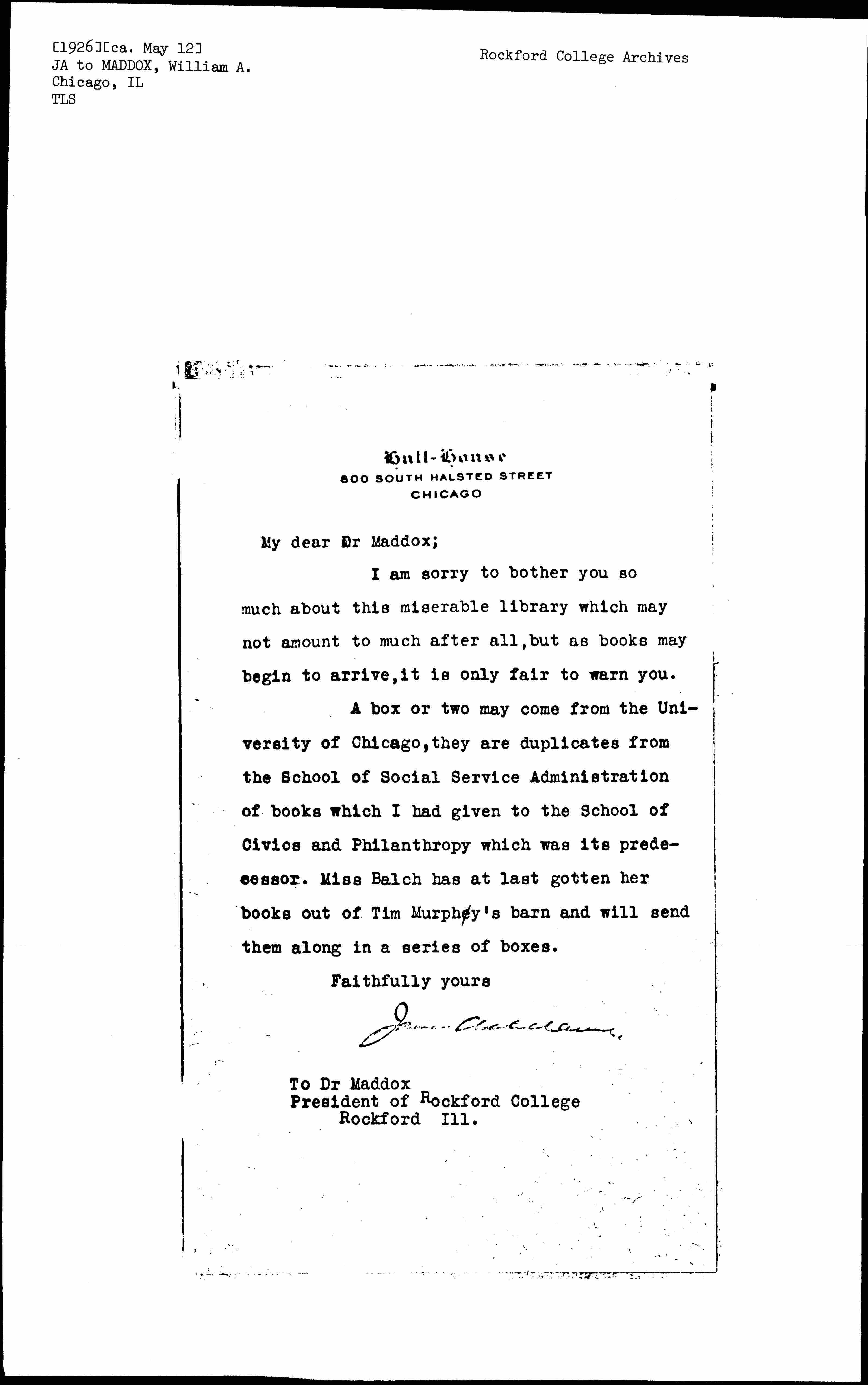 A box or two may come from the University of Chicago, they are duplicates from the School of Social Service Administration of books which I had given to the School of Civics and Philanthropy which was its predecessor. Miss Balch has at last gotten her books out of Tim Murphy's barn and will send them along in a series of boxes.