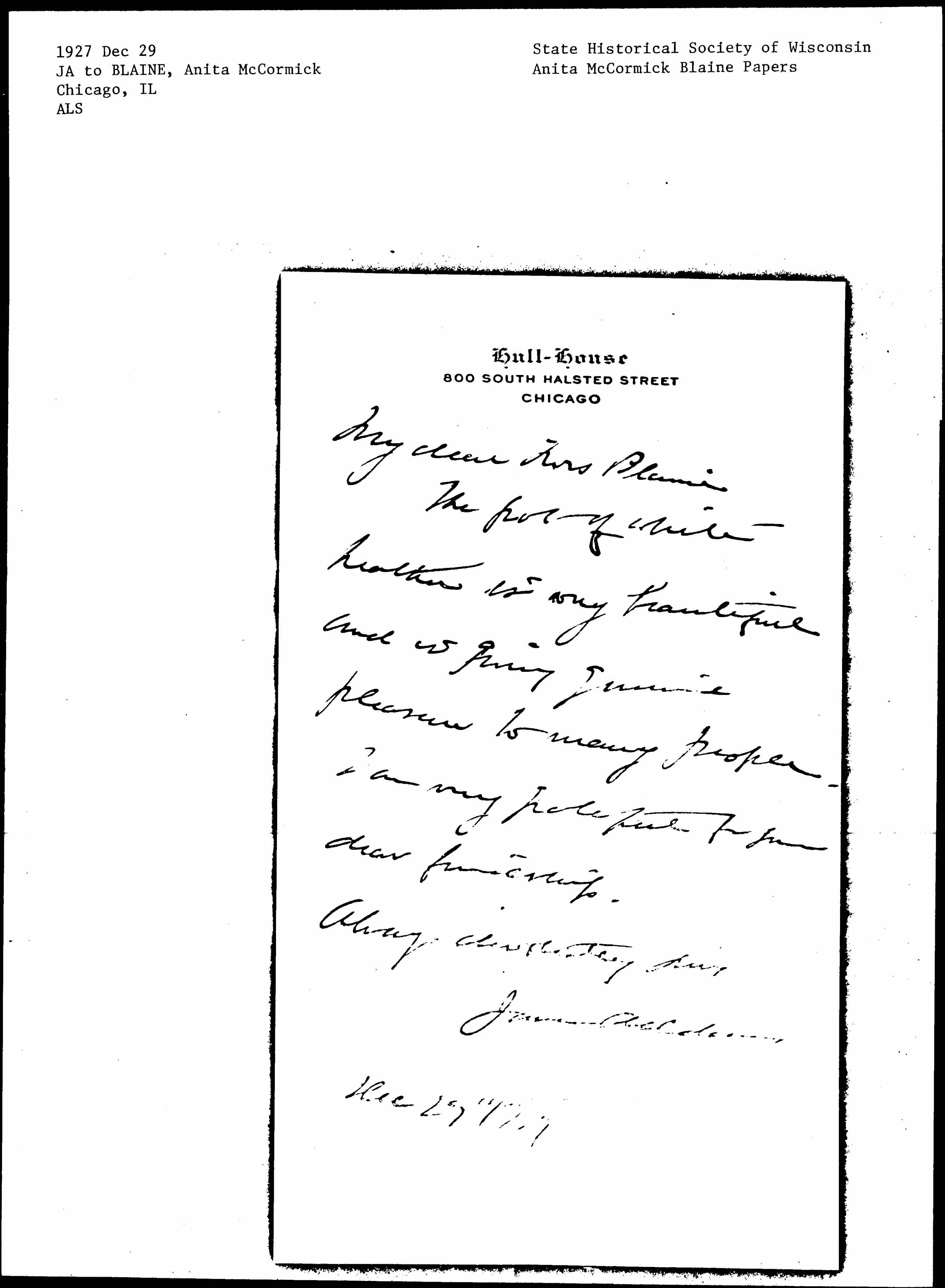 Jane Addams to Anita McCormick Blaine, December 29, 1927