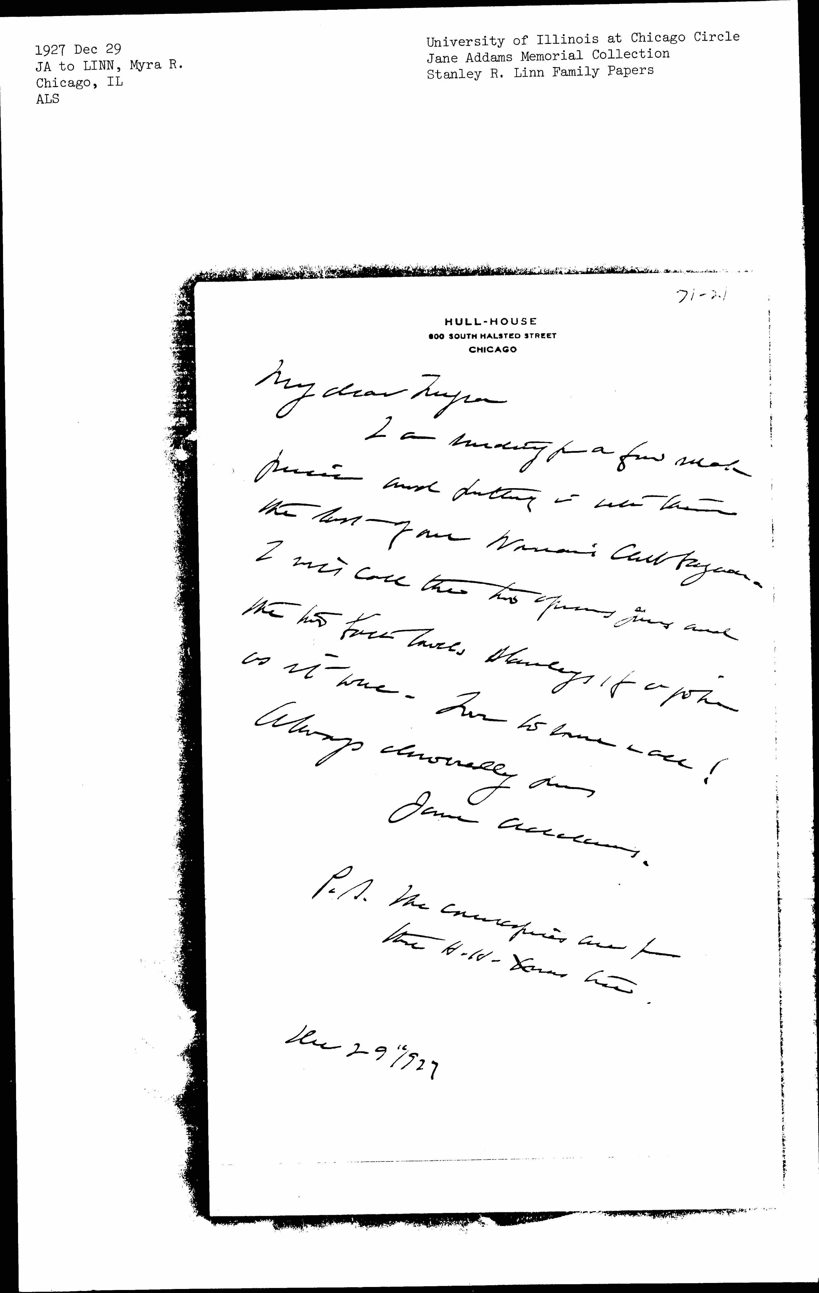 Jane Addams to Myra Harriet Reynolds Linn, December 29, 1927