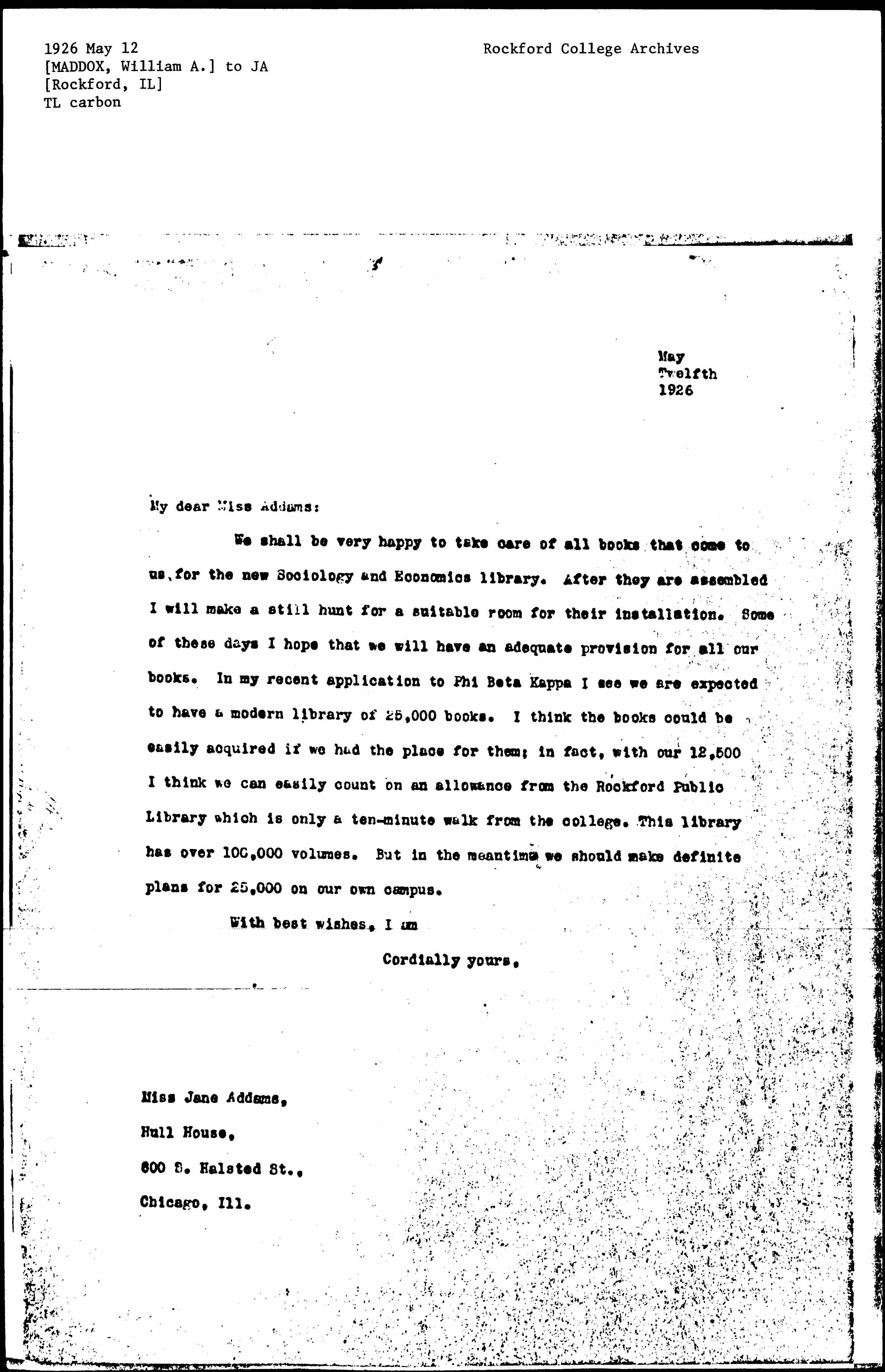 We shall be very happy to take care of all books that come to us for the new Sociology and Economics library. After they are assembled I will make a still hunt for a suitable room for their installation. Some of these days I hope that we will have an adequate provision for all our books. In my recent application to Phi Beta Kappa I see we are expected to have a modern library of 25,000 books. I think the books could be easily acquired if we had the place for them; in fact, with our 12,500 I think we can easily count on an allowance from the Rockford Public Library which is only a ten-minute walk from the college. This library has over 100,000 volumes. But in the meantime we should make definite plans for 25,000 on our own campus.