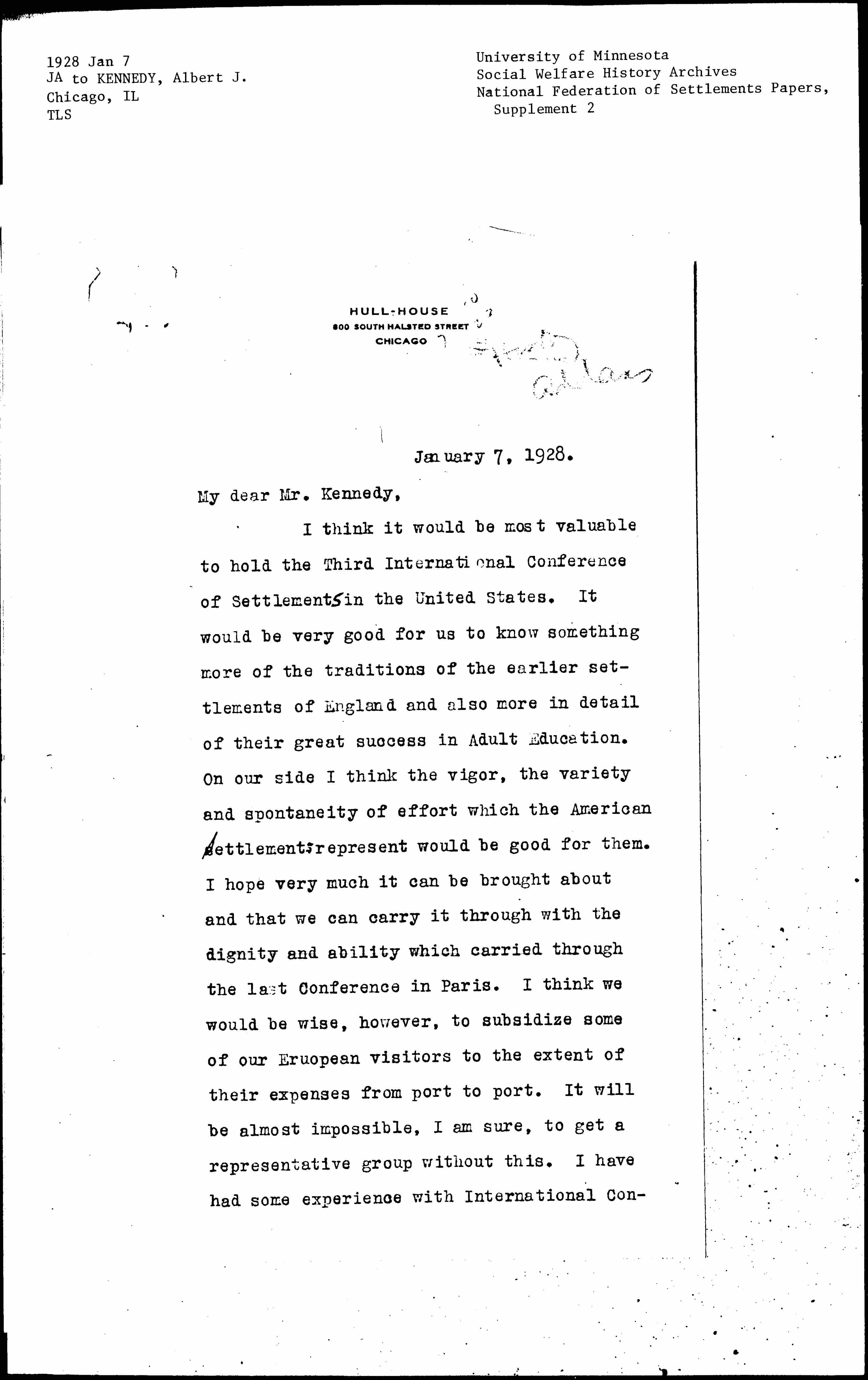 Jane Addams to Albert Joseph Kennedy, January 7, 1928