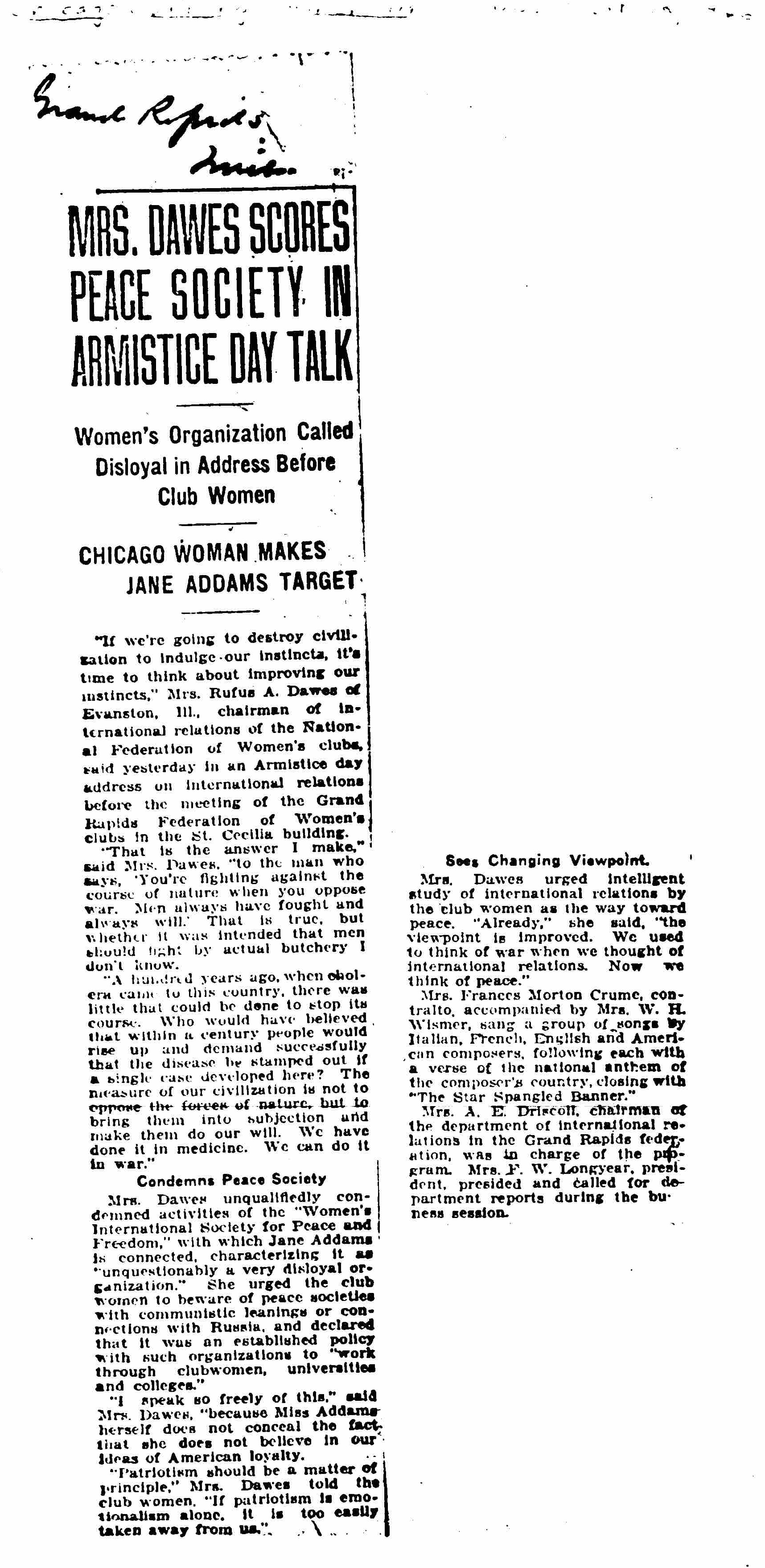 Mrs. Dawes unqualifiedly condemned activities of the "Women's International Society for Peace and Freedom," with which Jane Addams is connected, characterizing it as "unquestionably a very disloyal organization." She urged the club women to beware of peace societies with communistic leanings or connections with Russia, and declared that it was an established policy with such organizations to "work through clubwomen, universities and colleges."