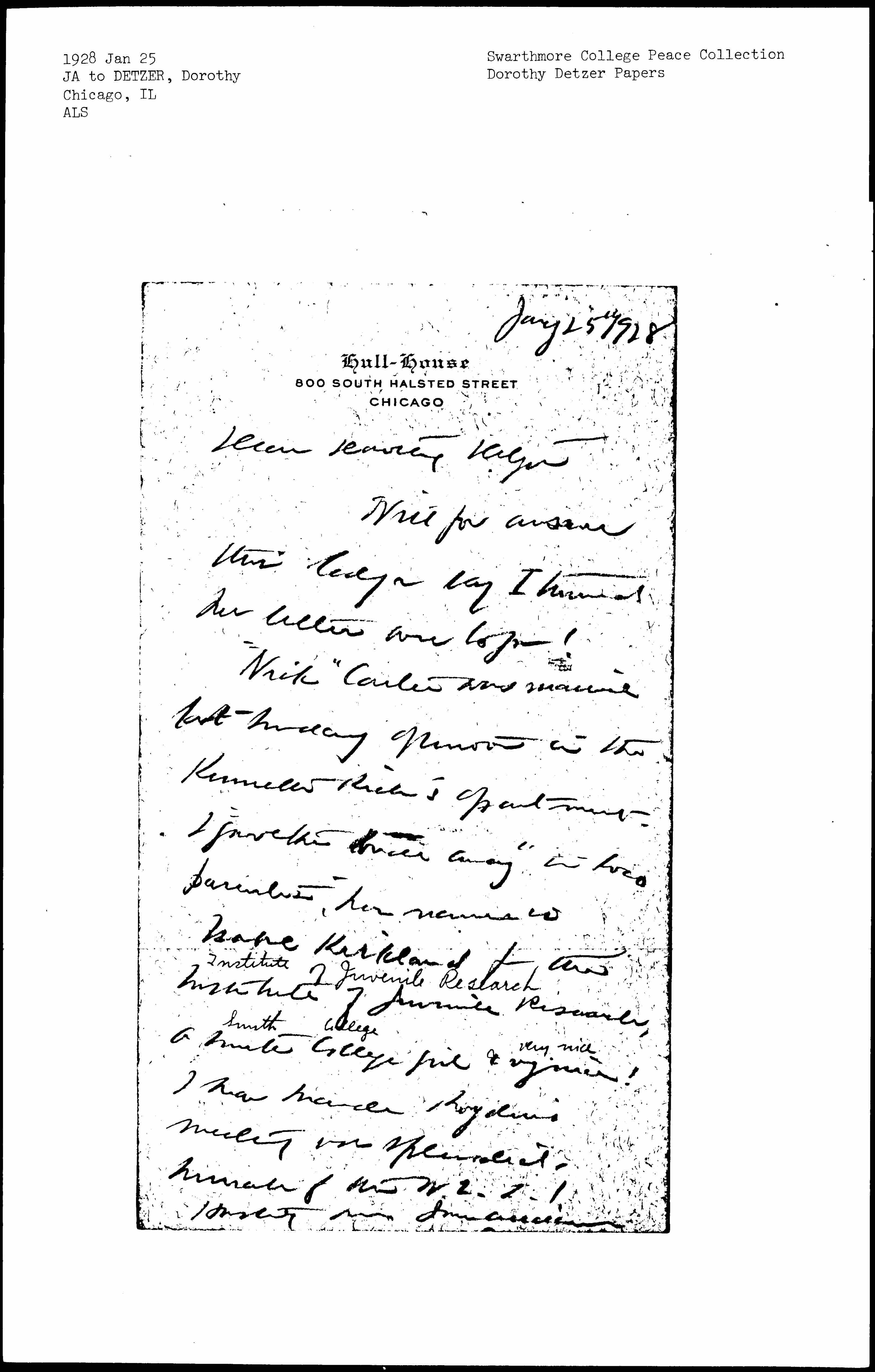 Jane Addams to Dorothy Detzer, January 25, 1928