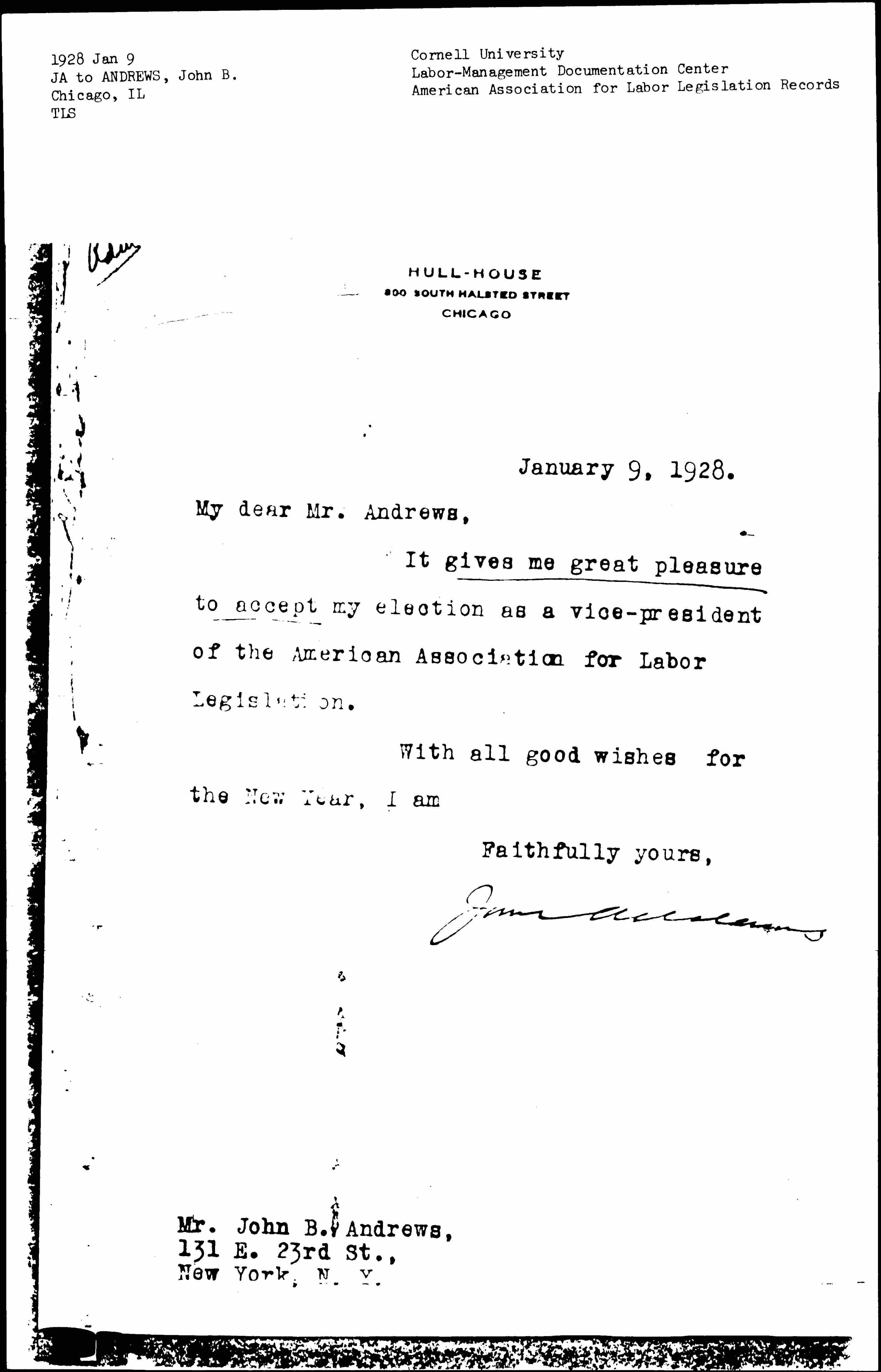 Jane Addams to John Bertram Andrews, January 9, 1928