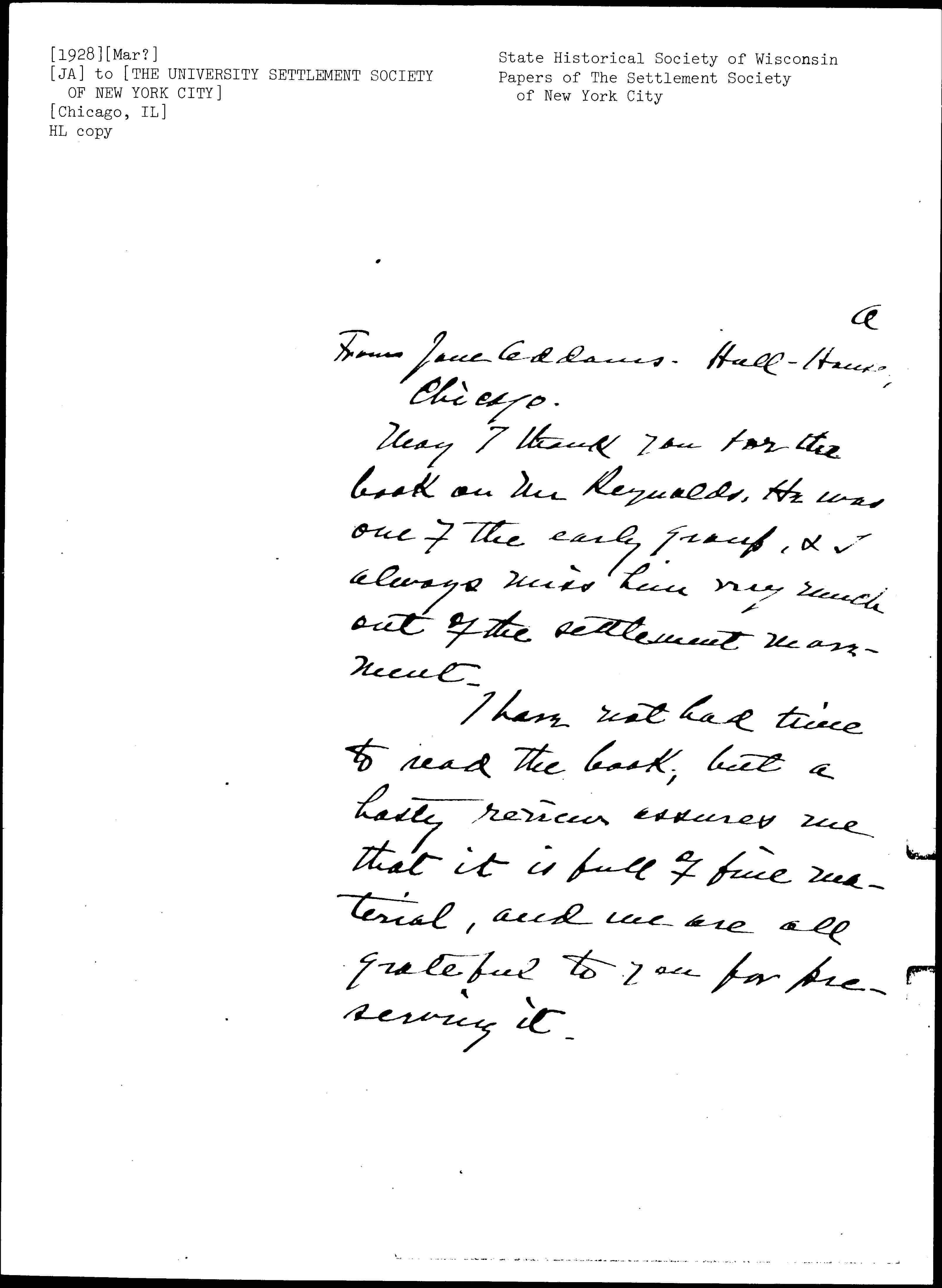 Jane Addams to the University Settlement Society of New York City, ca. March 1928