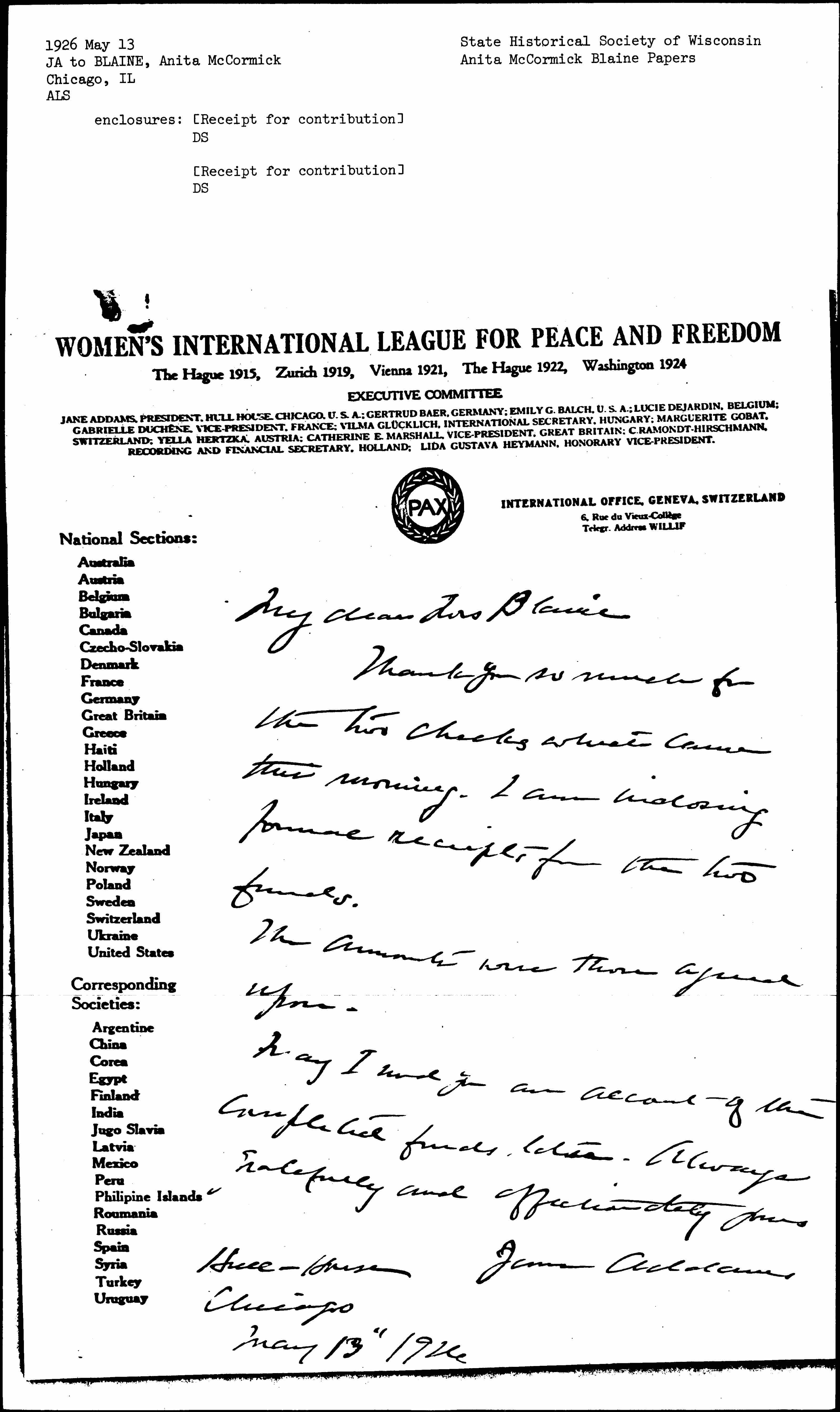 Thank you so much for the two checks which came this morning. I am [enclosing] formal receipts from the two funds.