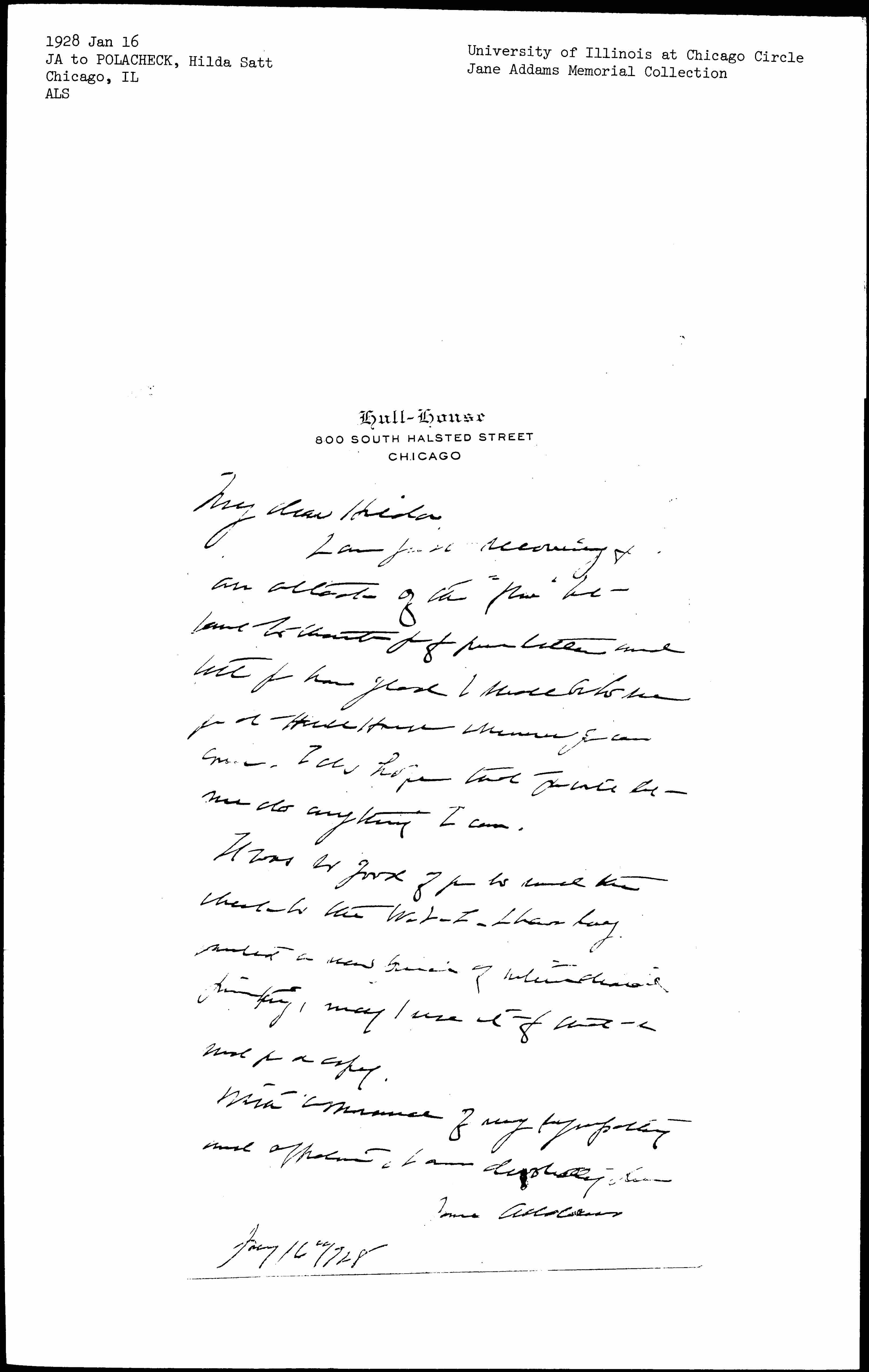 Jane Addams to Hilda Satt Polacheck, January 16, 1928