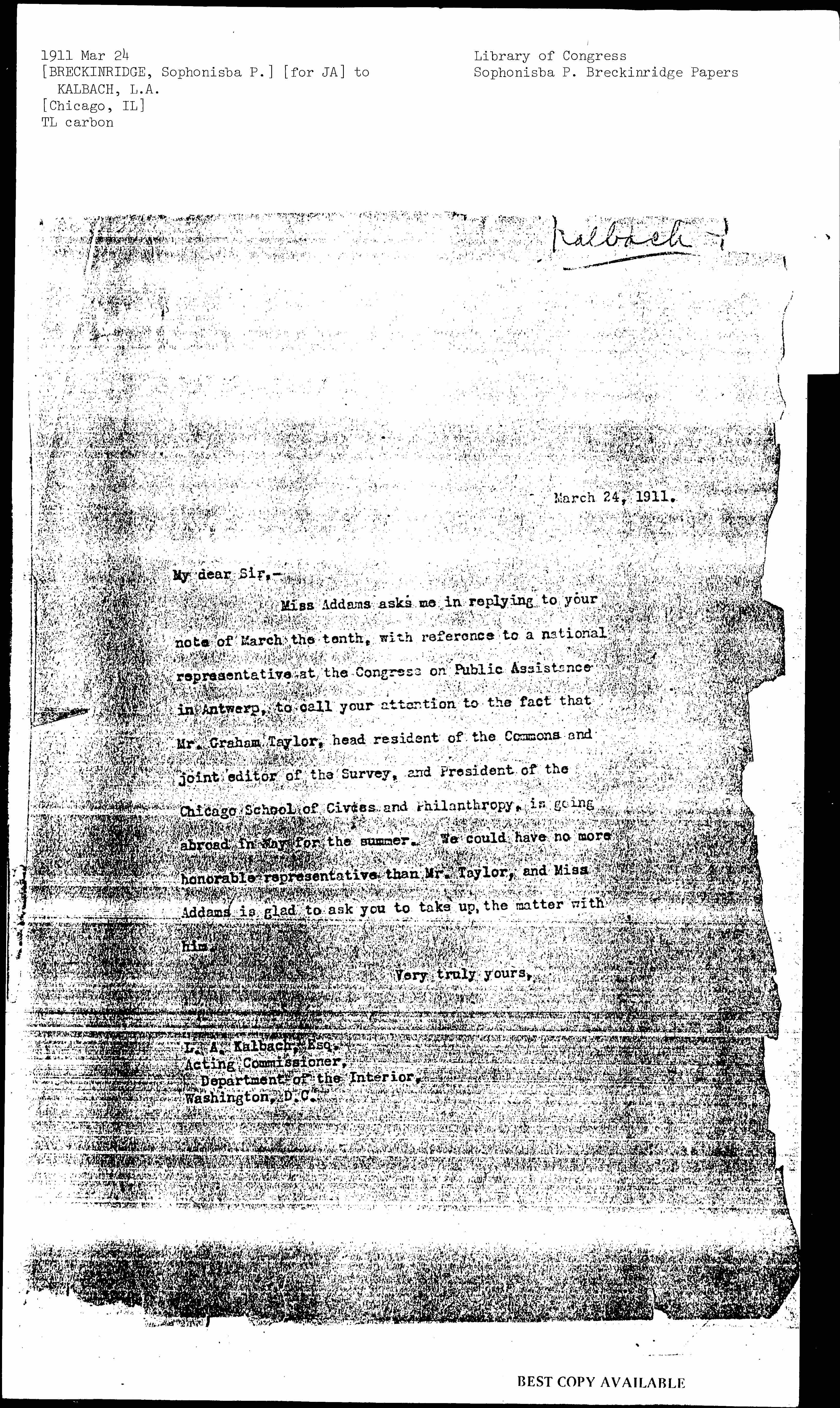 Miss Addams asks me in replying to your note of March the tenth, with reference to a national representative at the Congress on Public Assistance in Antwerp, to call your attention to the fact that Mr. Graham Taylor, head resident of the Commons and joint editor of the Survey, and President of the Chicago School of Civics and Philanthropy, in going abroad in May for the summer. We could have no more honorable representative than Mr. Taylor, and Miss Addams is glad to ask you to take up, the matter with him.