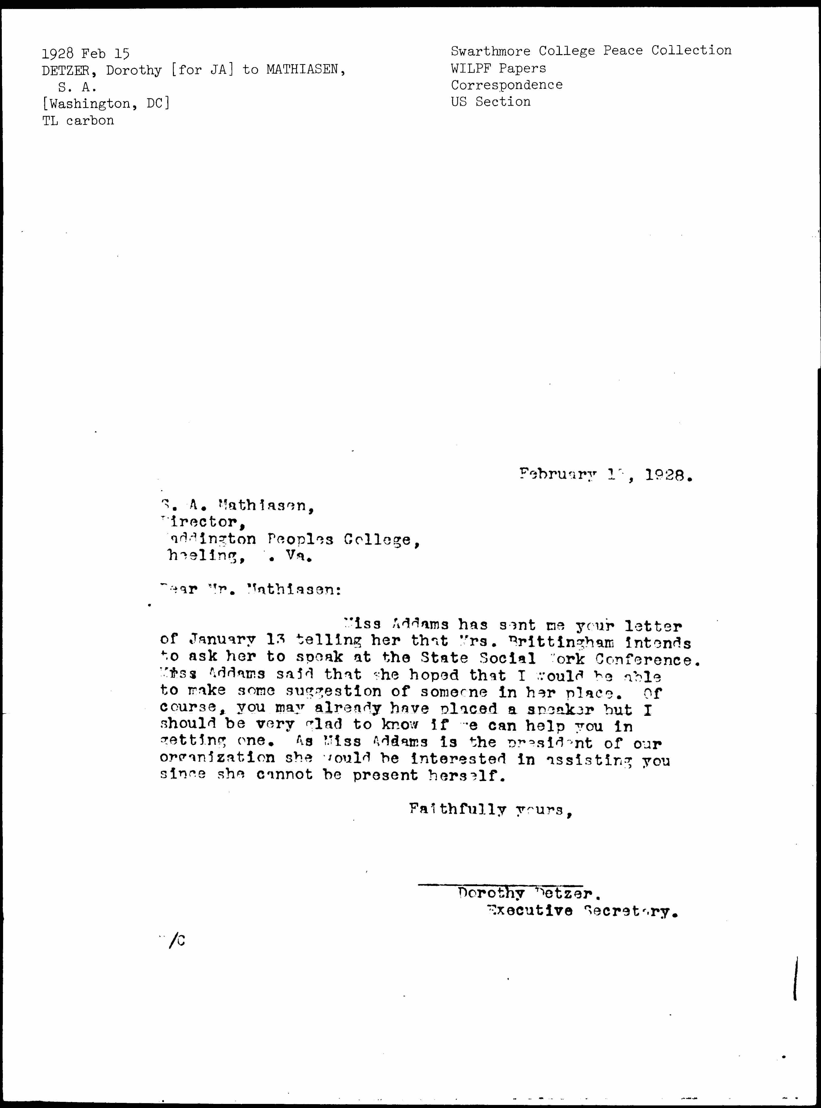 Dorothy Detzer to Soren Andrew Mathiasen, February 15, 1928