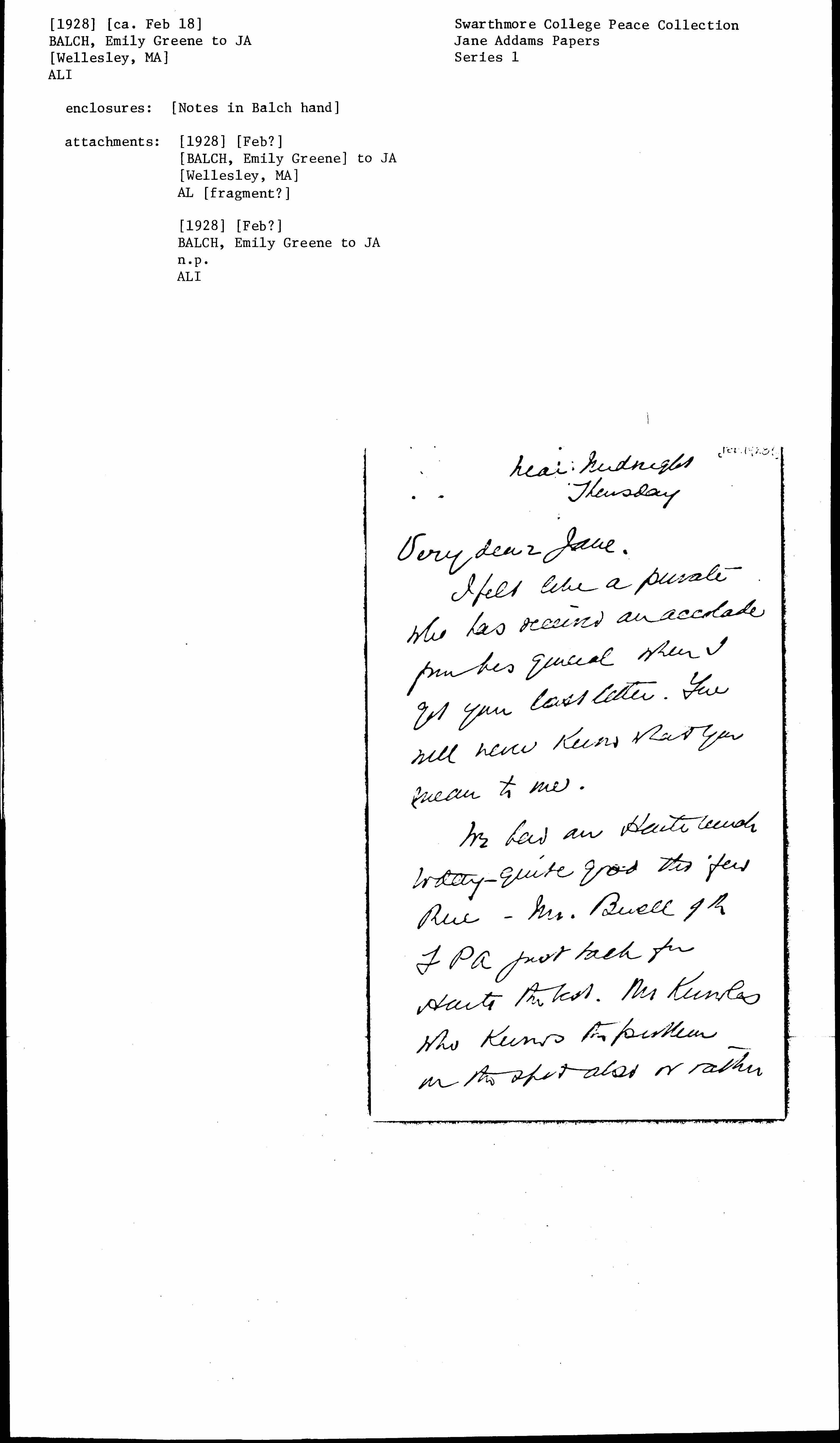Emily Greene Balch to Jane Addams, ca. February 1928