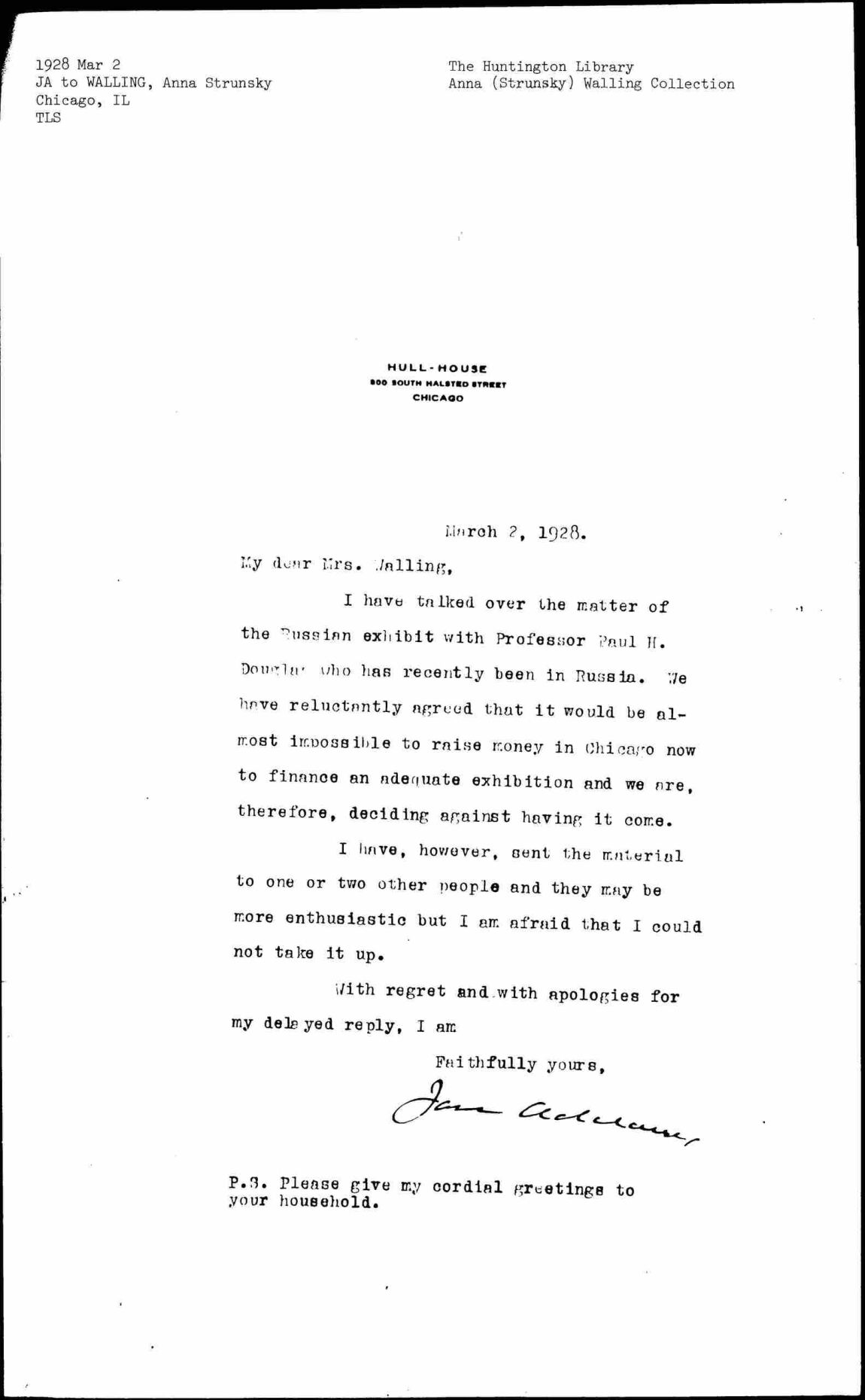 Jane Addams to Anna Strunsky Walling, March 2, 1928