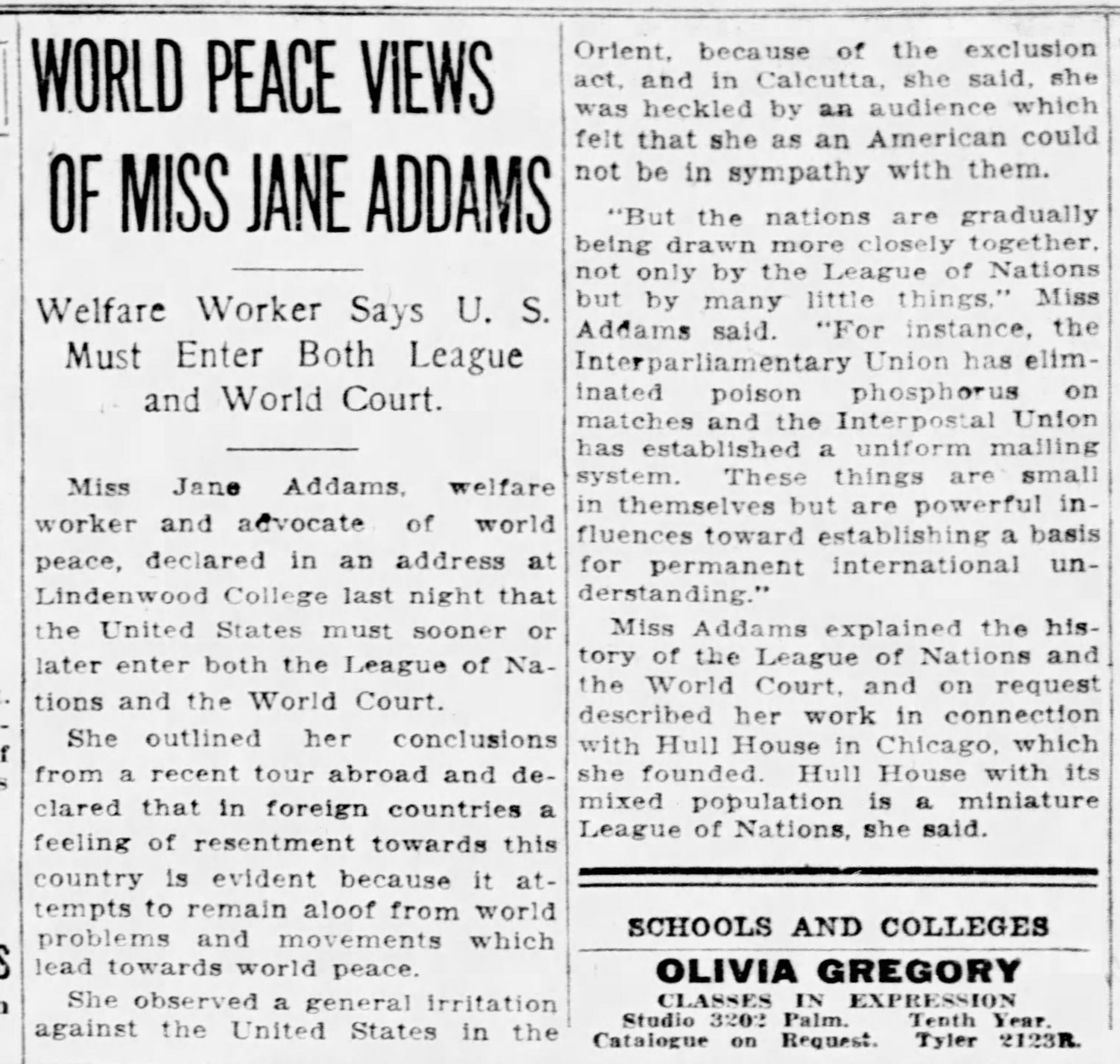 "But the nations are gradually being drawn more closely together, not only by the League of Nations but by many little things," Miss Addams said. "For instance, the Interparliamentary Union has eliminated poison phosphorus on matches and the Interpostal Union has established a uniform mailing system. These things are small in themselves but are powerful influences toward establishing a basis for permanent international understanding."