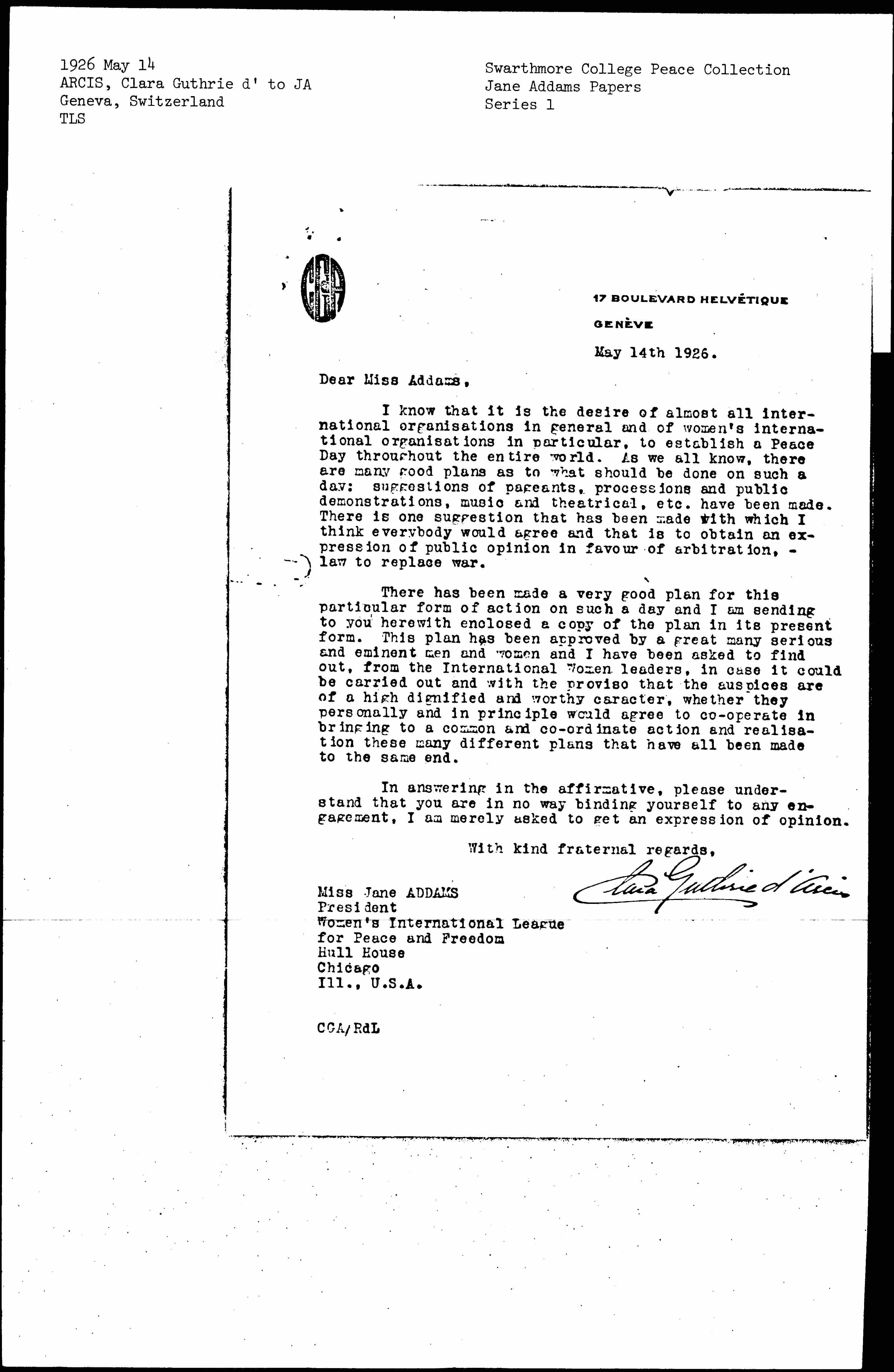 There has been made a very good plan for this particular form of action on such a day and I am sending to you herewith enclosed a copy of the plan in its present form. This plan has been approved by a great many serious and eminent men and women and I have been asked to find out, from the International Women leaders, in case it could be carried out and with the proviso that the auspices are of a high dignified and worthy [character], whether they personally and in principle would agree to [cooperate] in bringing to a common and [coordinate] action and [realization] these many different plans that have all been made to the same end.