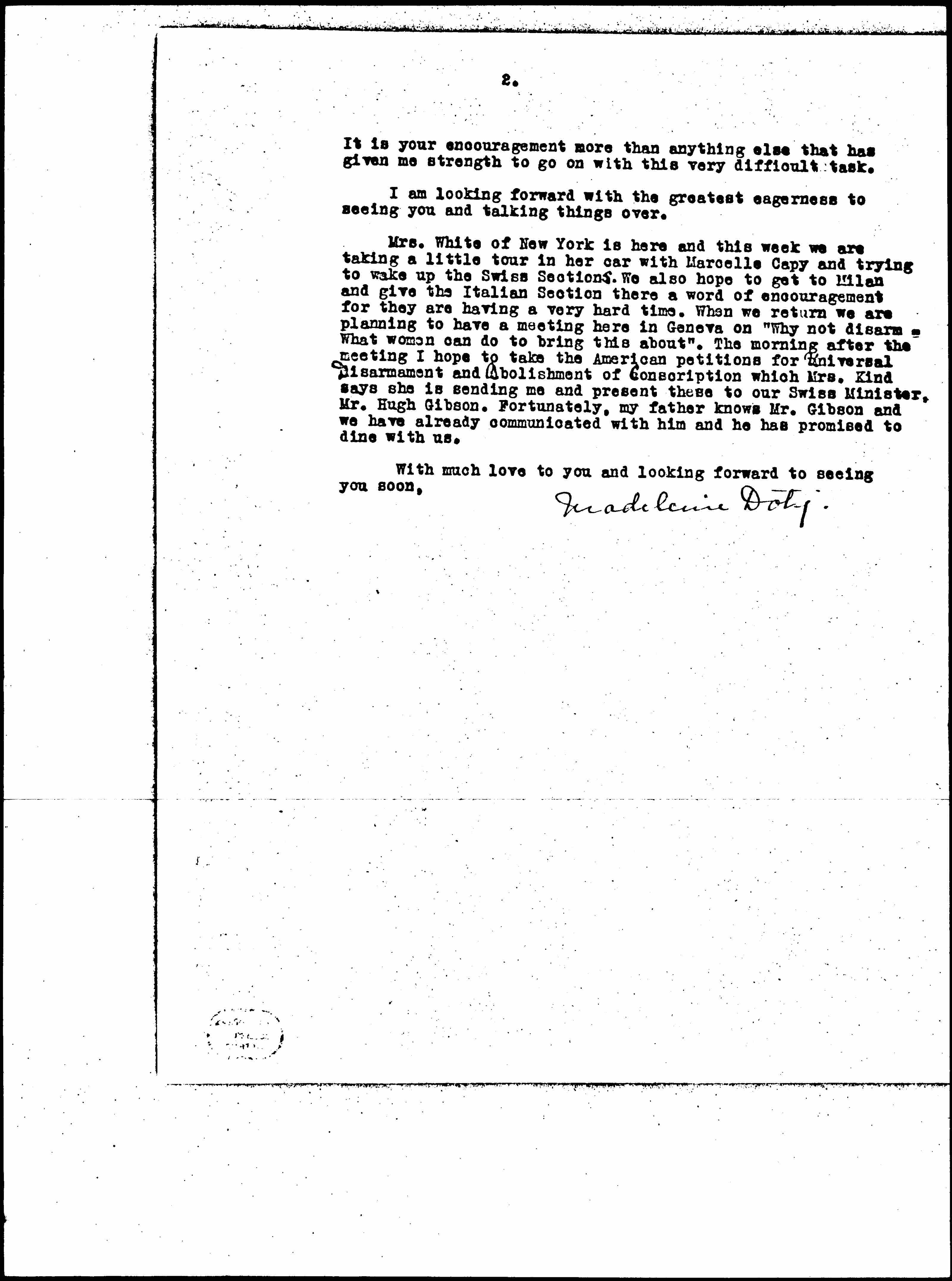 Mrs. White of New York is here and this week we are taking a little tour in her car with Marcelle Capy and trying to wake up the Swiss Sections. We also hope to get to Milan and give the Italian Section there a word of encouragement for they are having a very hard time. When we return we are planning to have a meeting here in Geneva on "Why not disarm -- What women can do to bring this about." The morning after the meeting I hope to take the American petitions for Universal Disarmament and Abolishment of Conscription which Mrs. Kind says she is sending me and present these to our Swiss Minister, Mr. Hugh Gibson. Fortunately, my father knows Mr. Gibson and we have already communicated with him and he has promised to dine with us.