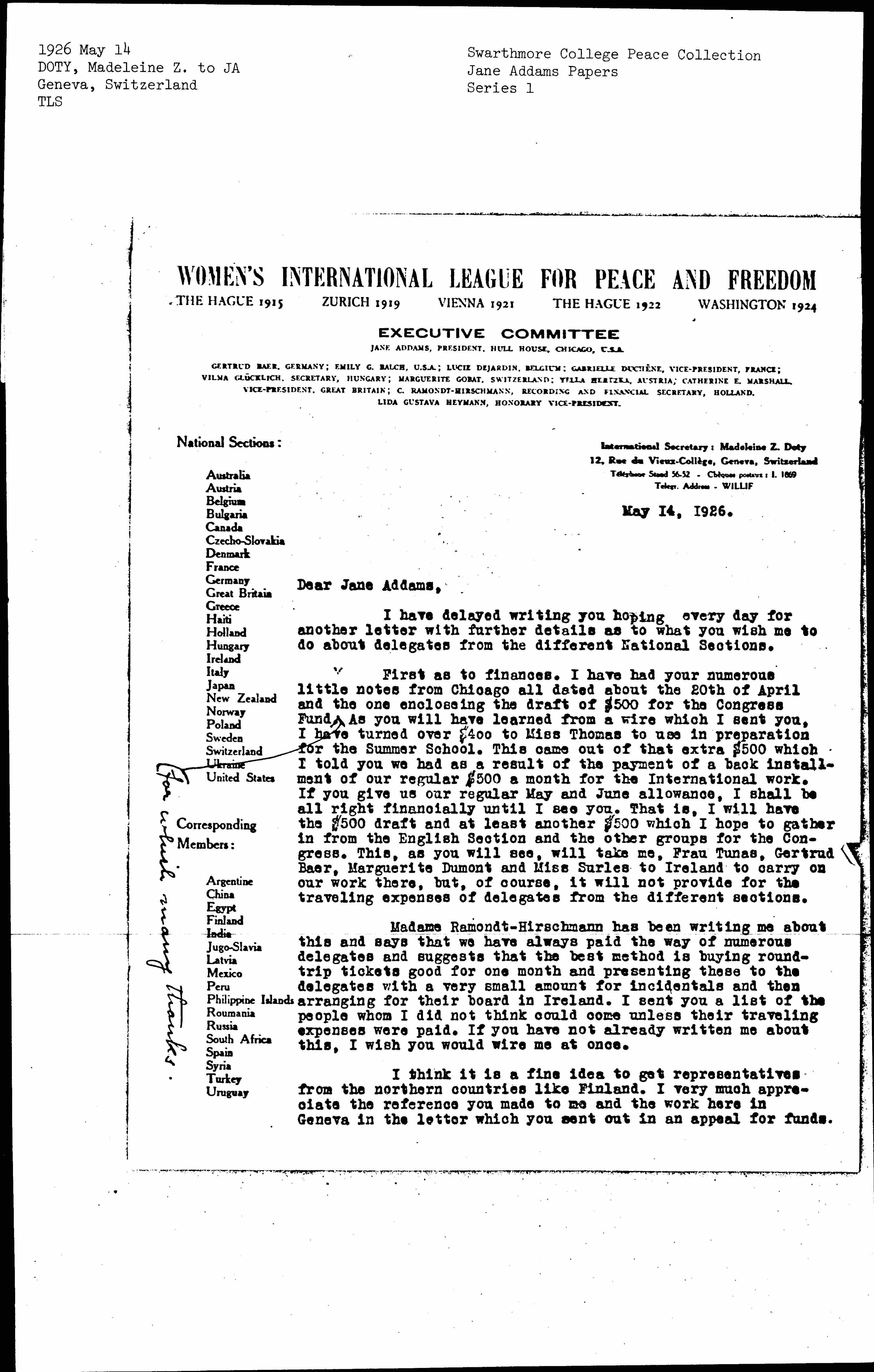 First as to finances. I have had your numerous little notes from Chicago all dated about the 20th of April and the one [enclosing] the draft of $500 for the Congress Fund ↑for which many thanks↓. As you will have learned from a wire which I sent you, I have turned over $400 to Miss Thomas to use in preparation for the Summer School. This came out of that extra $500 which I told you we had as a result of the payment of a back installment of our regular $500 a month for the International work. If you give us our regular May and June allowance, I shall be all right financially until I see you. That is, I will have the $500 draft and at least another $500 which I hope to gather in from the English Section and the other groups for the Congress. This, as you will see, will take me, Frau Tunas, Gertrud Baer, Marguerite Dumont and Miss Surles to Ireland to carry on our work there, but, of course, it will not provide for the traveling expenses of delegates from the different sections.