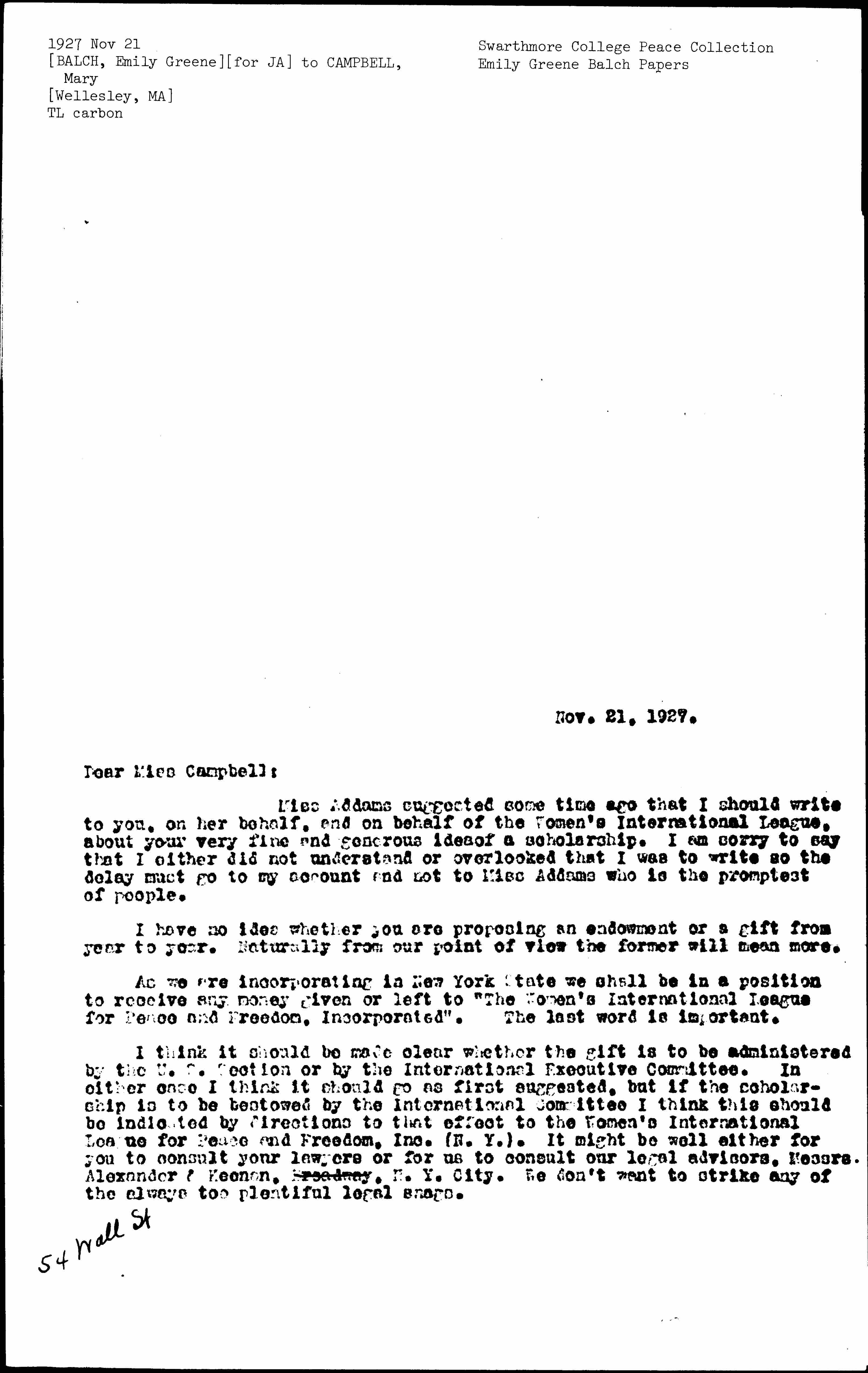 Emily Greene Balch to Mary Campbell, November 21, 1927