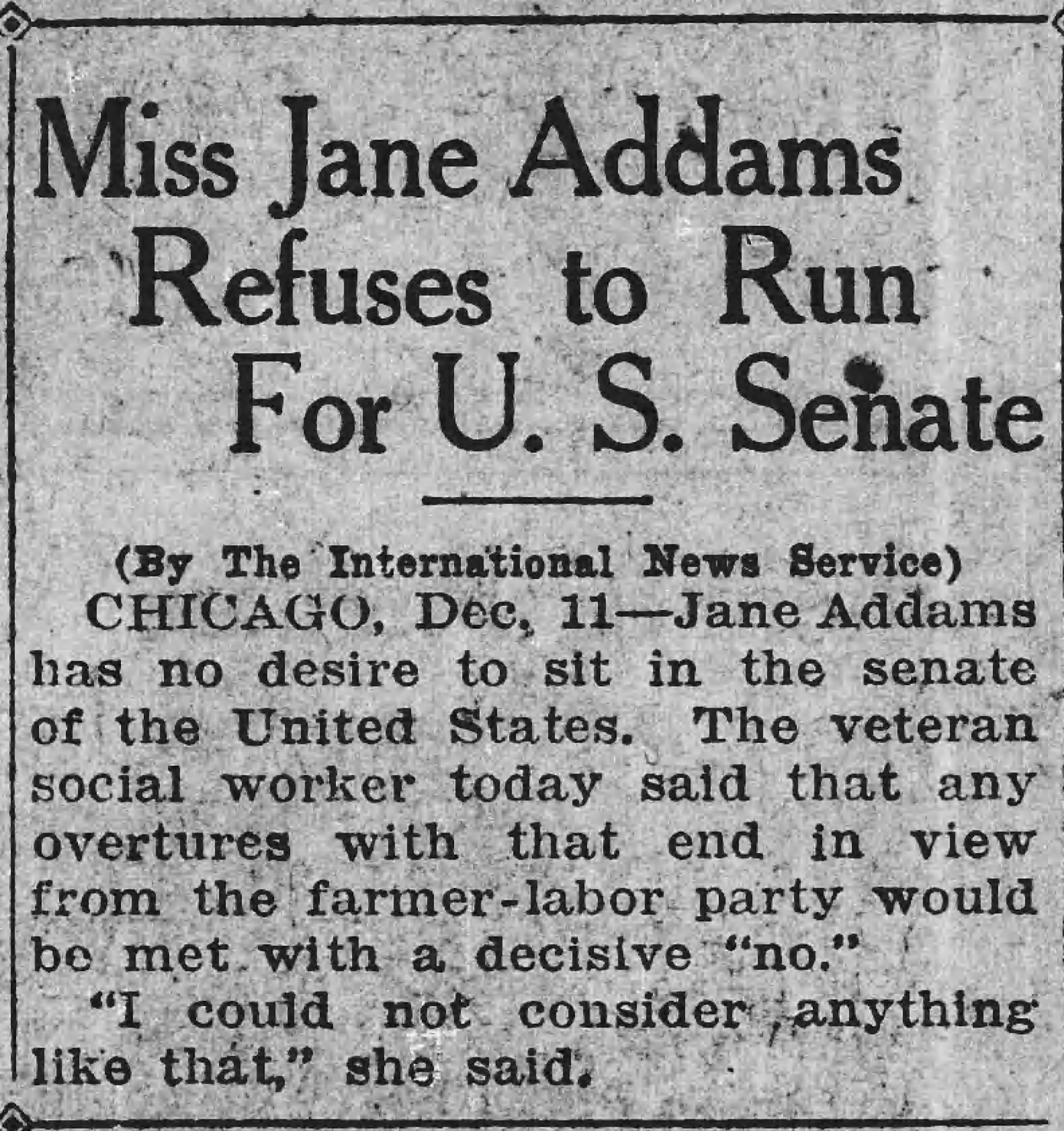 Jane Addams has no desire to sit in the senate of the United States. The veteran social worker today said that any overtures with that end in view from the farmer-labor party would be met with a decisive "no."