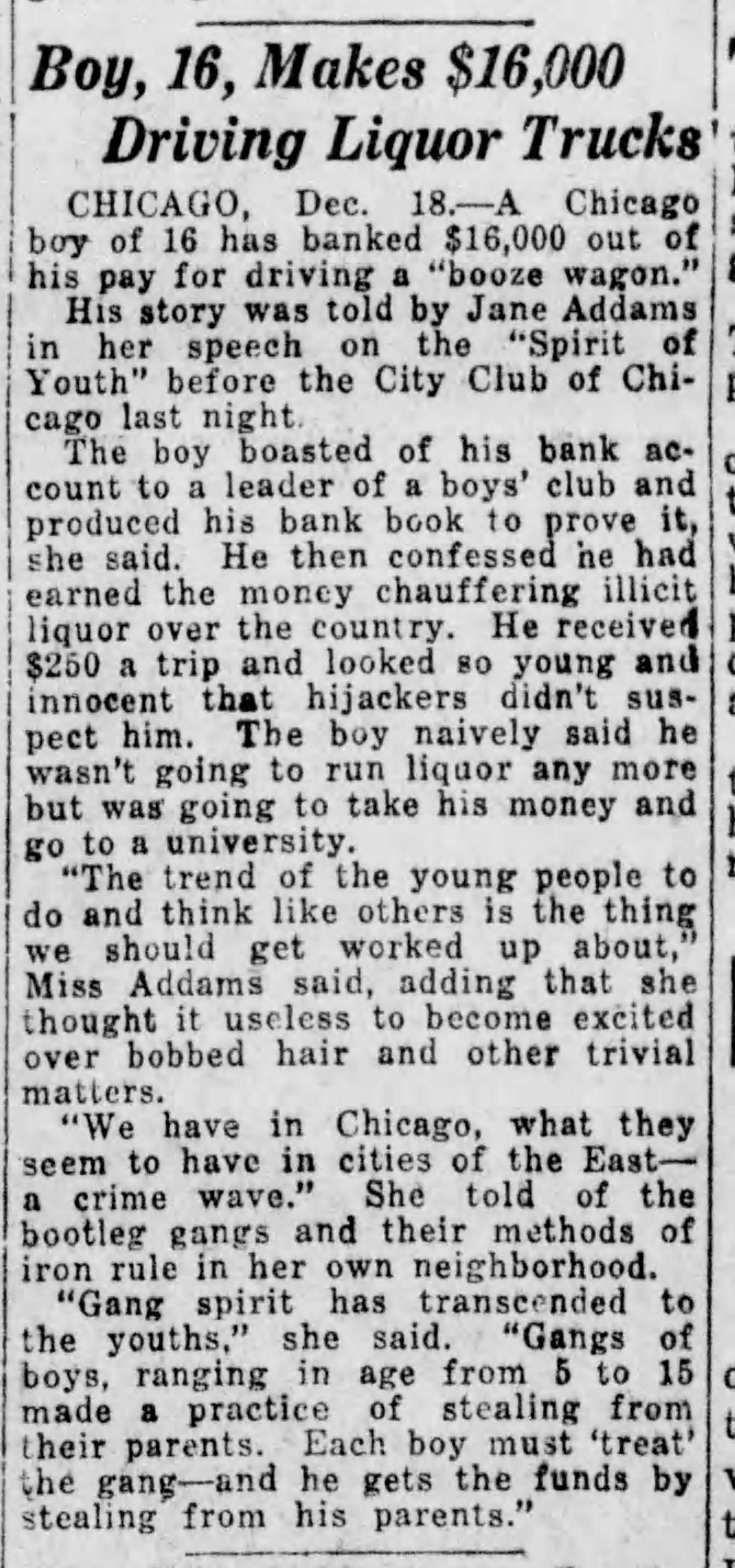 "We have in Chicago, what they seem to have in cities of the East -- a crime wave." She told of the bootleg gangs and their methods of iron rule in her own neighborhood.
