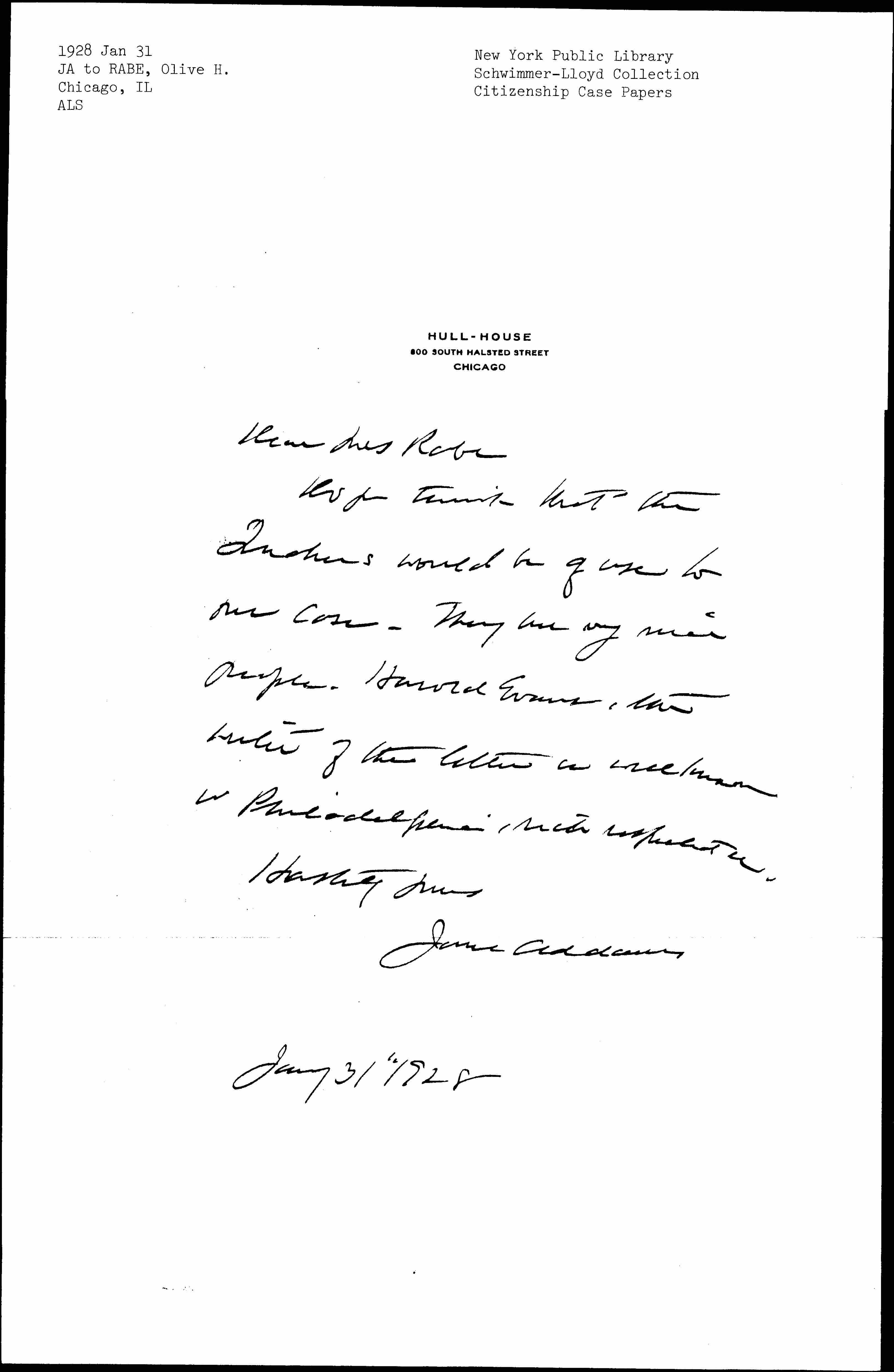 Jane Addams to Olive Hanson Rabe, January 31, 1928